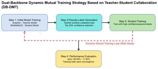 An Enhanced Dual-Backbone Dynamic Mutual Training (DB-DMT) adapts the original Dynamic Mutual Training (DMT) strategy [34] for remote sensing by iteratively exchanging high-quality pseudo-labels between architecturally distinct networks (Xception and MobileNetV2). Unlike the original single-backbone DMT—which relies on dynamic bias weights and risks confirmation bias—this bidirectional distillation achieves 3.33 pp mIoU improvement (68.59% → 71.92%) with only 24.5% samples labeled.