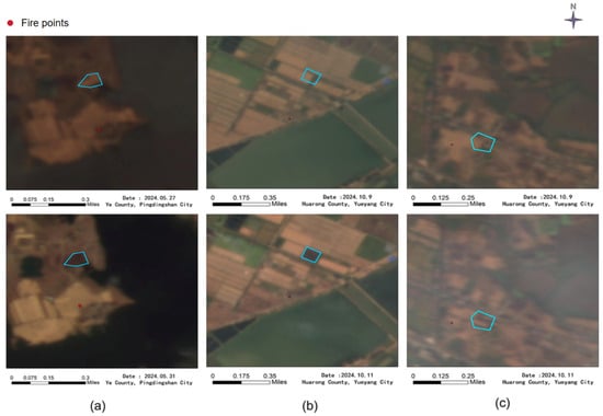Open burning of crop residues, particularly rice and wheat straw, represents a critical yet episodic source of regional air pollution in agricultural regions worldwide. In China, the total theoretical yield of crop straw nationwide reached 700 million tonnes in 2014 [1], However, constrained by inadequate comprehensive utilization infrastructure, an estimated 100 million tons is still burned in situ despite government bans [2,3], contributing to severe regional haze events that can elevate ambient PM2.5 concentrations by 3–5 times within hours [4,5]. The implementation of China’s nationwide straw burning ban since 2015 has created urgent demand for large-scale, near-real-time monitoring systems to support enforcement [6]. However, traditional ground-based patrol methods face fundamental scalability problems: with over 2 million km2 of cropland distributed across diverse agricultural regions [7], field inspections cannot achieve the temporal coverage needed to detect short-duration burning events (often lasting only 1–3 h) or the spatial coverage to identify scattered hotspots across provincial boundaries.