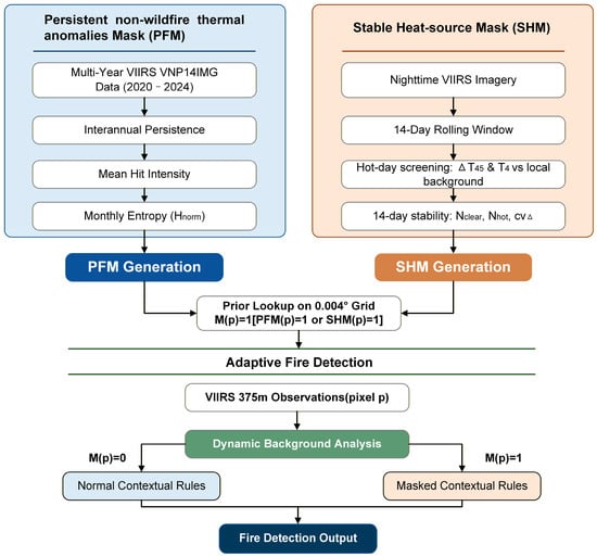 Rather than replacing the baseline VNP14-style detector, our method is implemented as a lightweight spatiotemporal prior layer that integrates into the pixel-level decision stage, specifically the background characterization and thresholding steps. Specifically, PFM and SHM are constructed on the same 0.004° fixed grid and used to enable prior-guided, pixel-level parameter switching: pixels flagged by either prior are processed using a stricter (“Masked”) parameter set, whereas all other pixels follow the baseline (“Normal”) configuration. Figure 1 summarizes the overall workflow.