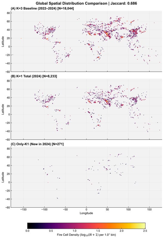 Spatiotemporal comparison of PFM: (A) K = 3 baseline (2022–2024); (B) K = 1 annual PFM (2024); and (C) newly detected PFM grid cells in 2024 relative to the baseline.