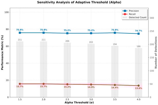 Sensitivity analysis of SHM parameters. For SHM, we test the robustness of the adaptive threshold over a representative East Asian sub-region. Increasing from 1.5 to 2.0 yields essentially unchanged precision/recall, and even retains ~88% of detections (Figure 5). We therefore use as a stable operational baseline.