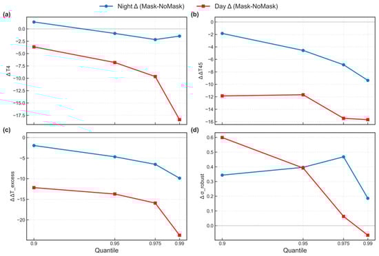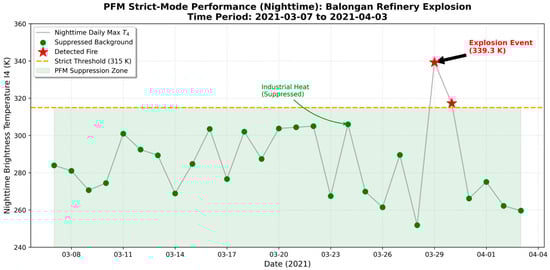 Parameter choices were guided by physical reasoning and quantitative trade-offs rather than ad hoc fitting. For PFM, the entropy threshold () filters strongly seasonal burning while retaining year-round sources. For SHM, the rolling window length targets a synoptic time scale to improve clear-sky observation probability, and the inclusion rule () is chosen to minimize cold-start latency. Masked-mode thresholds were calibrated using the systematic upper-tail shifts in anomaly indicators (Figure 7 and Figure 8) and a suppression–retention scan (Figure 9), ensuring robust rejection of persistent hotspots without overfitting.