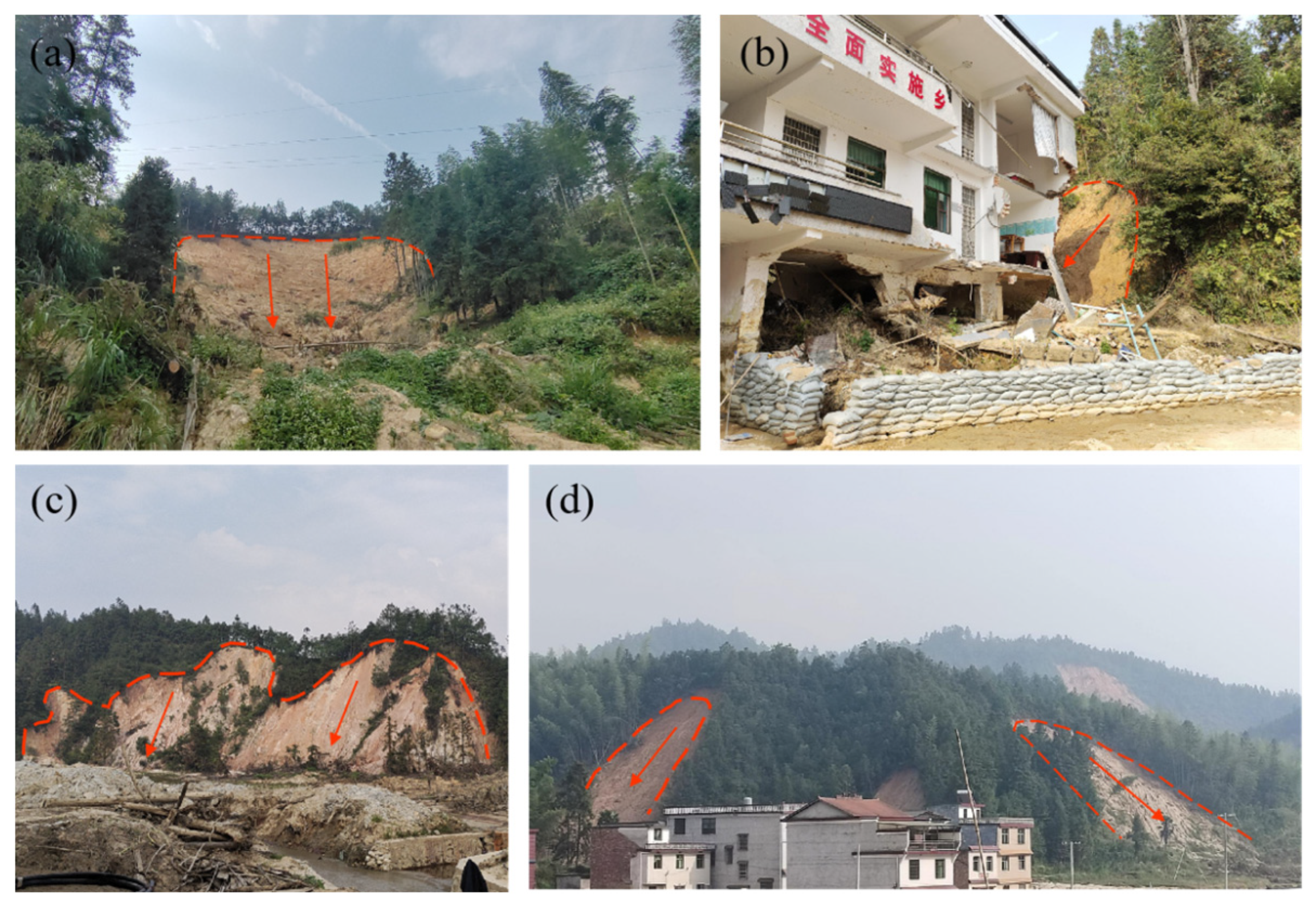 - Liu, R.; Xu, Q.; Pu, C.; Xu, F.; Wang, X.; Zhao, H.; Zhu, X.; He, N. Characteristics of Landslides Induced by Typhoon ‘Gaemi’ in Zixing, Hunan, July 2024, and Their Geological Control. Geomat. Inf. Sci. Wuhan Univ. 2025, 1–22. [Google Scholar] [CrossRef]