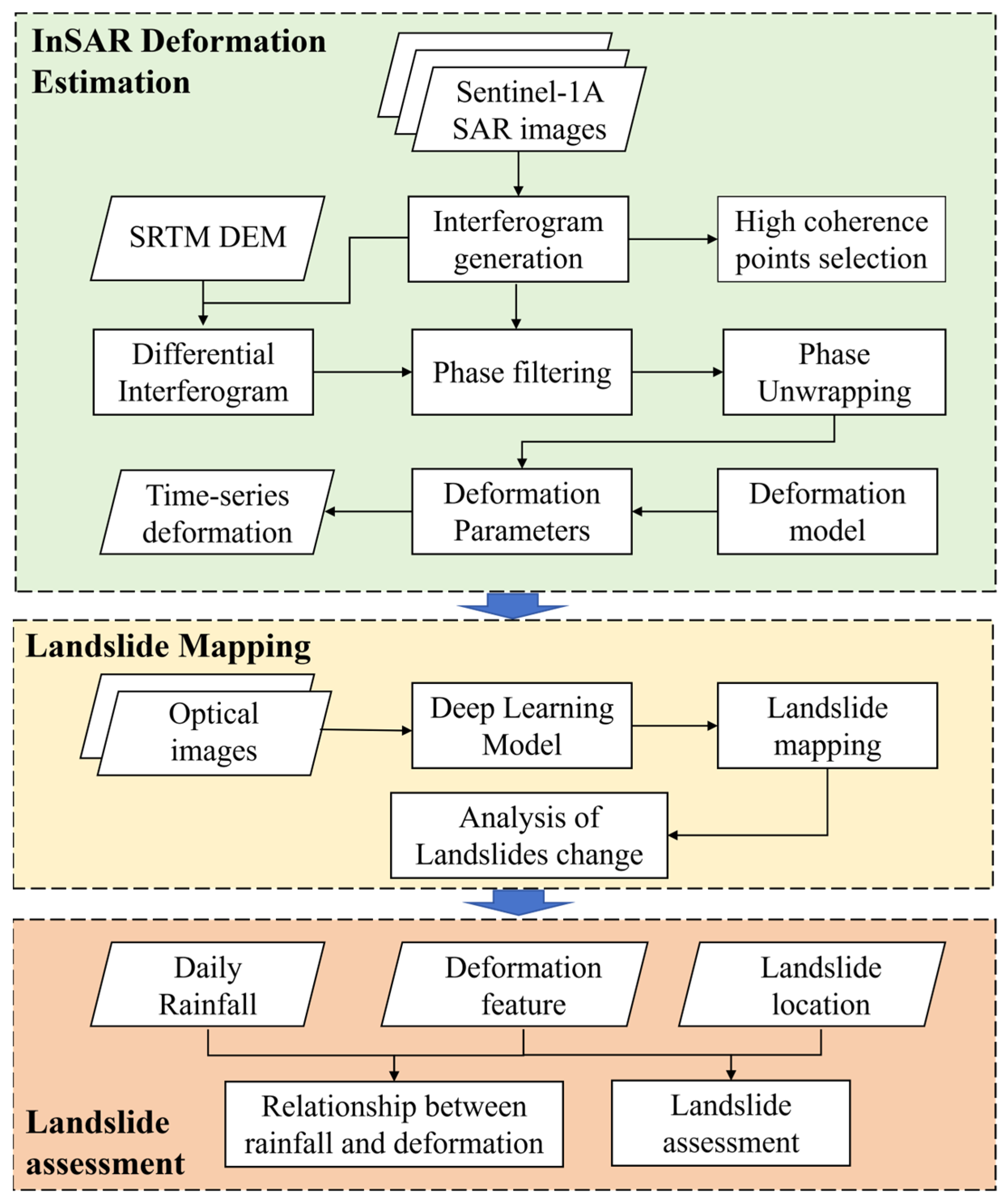 - Zheng, W.; Hu, J.; Lu, Z.; Hu, X.; Sun, Q.; Liu, J.; Huang, B. Enhancing 4-D landslide monitoring and block interaction analysis with a Novel Kalman-filter-based InSAR approach. J. Geophys. Res. Earth Surf. 2024, 129, e2024JF007923. [Google Scholar] [CrossRef]
