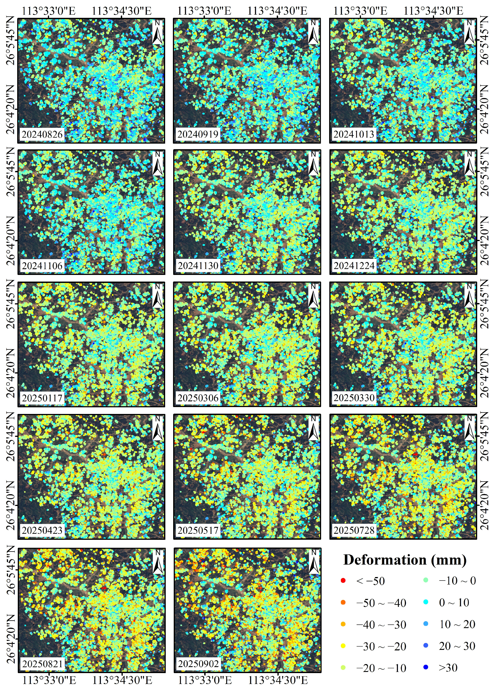 - Comprehensive InSAR monitoring revealed that nearly half (over 48%) of the rainfall-induced landslides in Zixing remained active or rapidly active during the year following the major disaster, with localized ground displacement rate exceeding 40 mm/year.