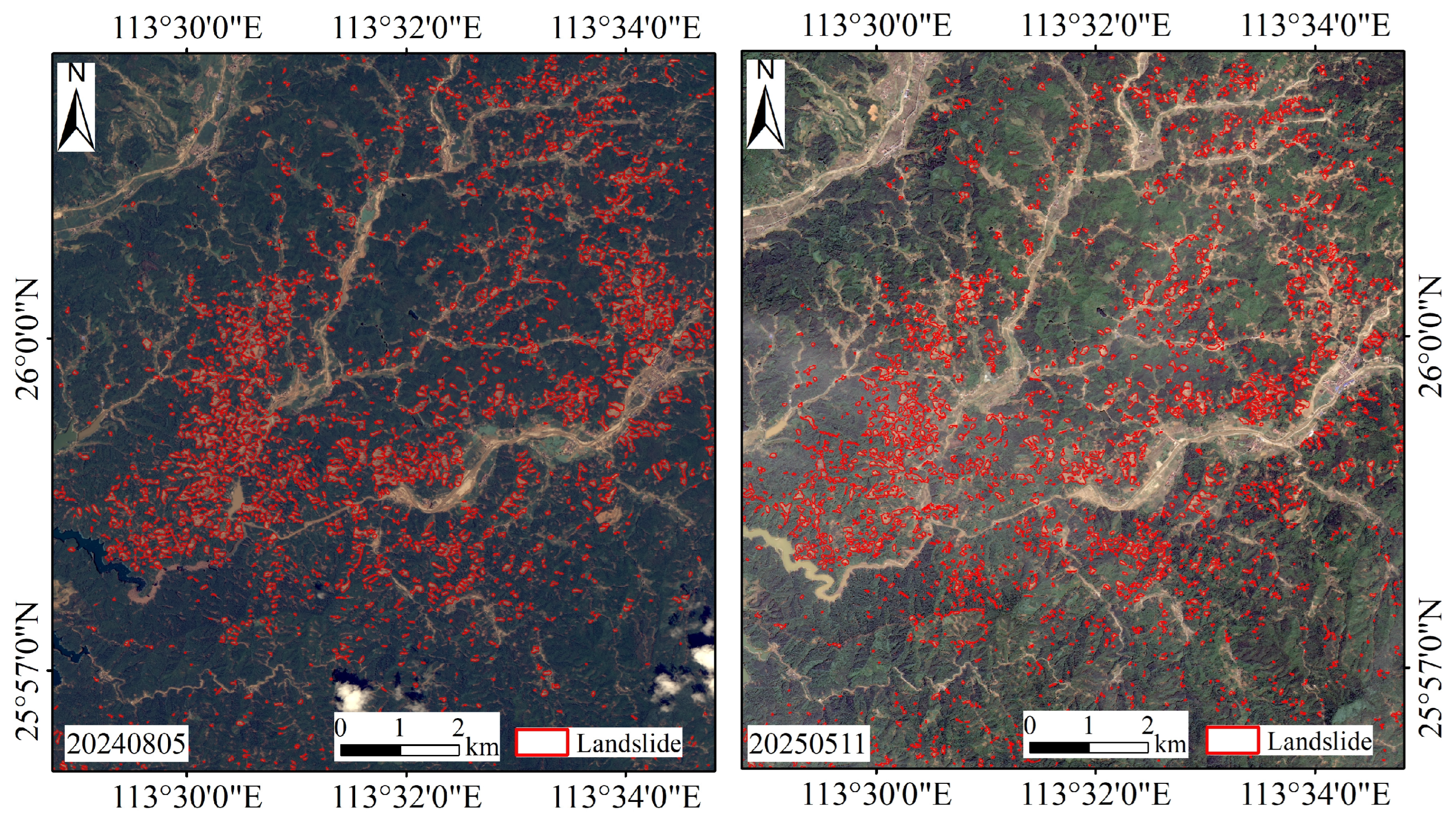 | [30] | Planet Scope | Deep Learning, machine Learning | A total of 16,120 landslides were identified. |
