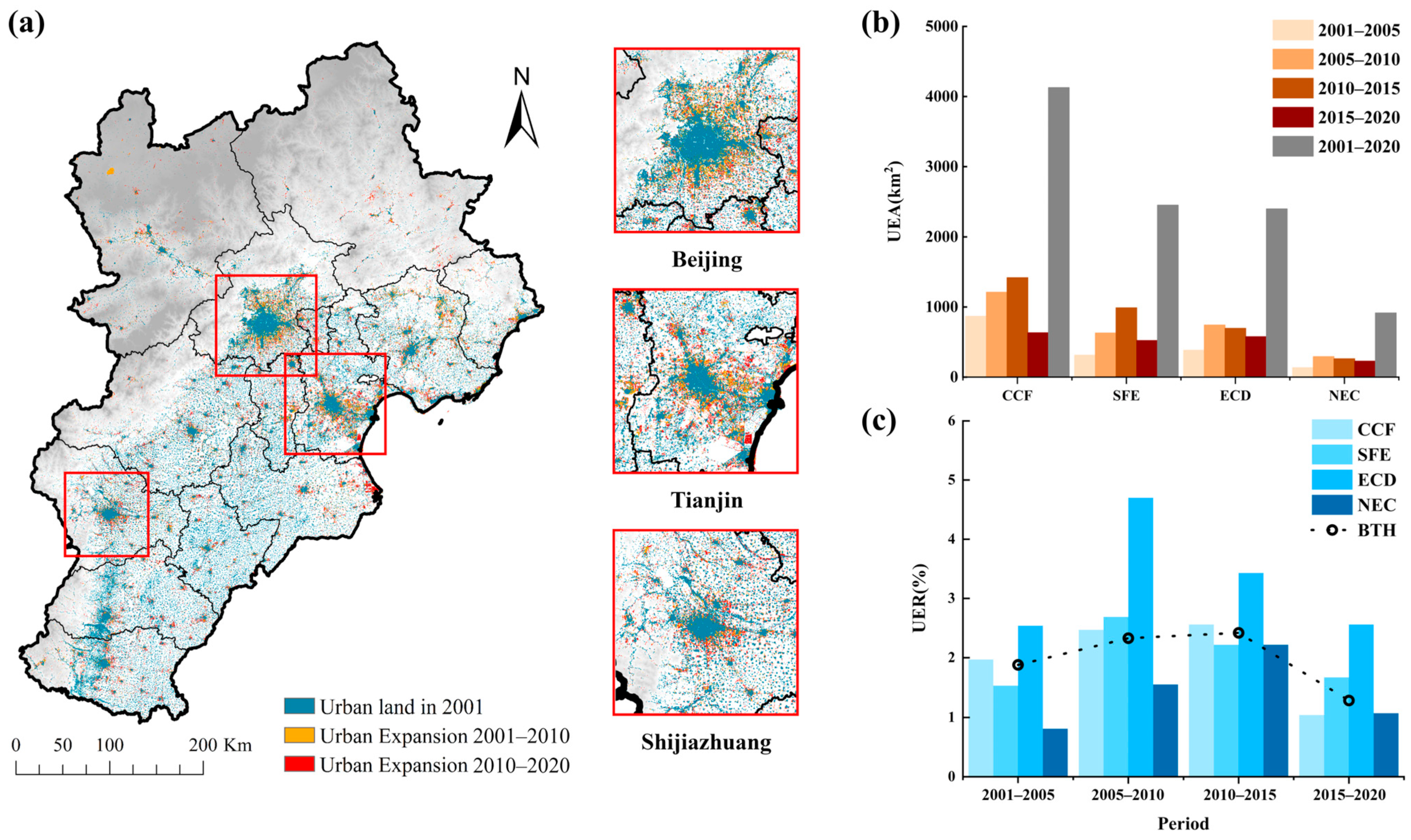 - Urban land in the Beijing–Tianjin–Hebei (BTH) region expanded by 45.2% between 2001 and 2020.