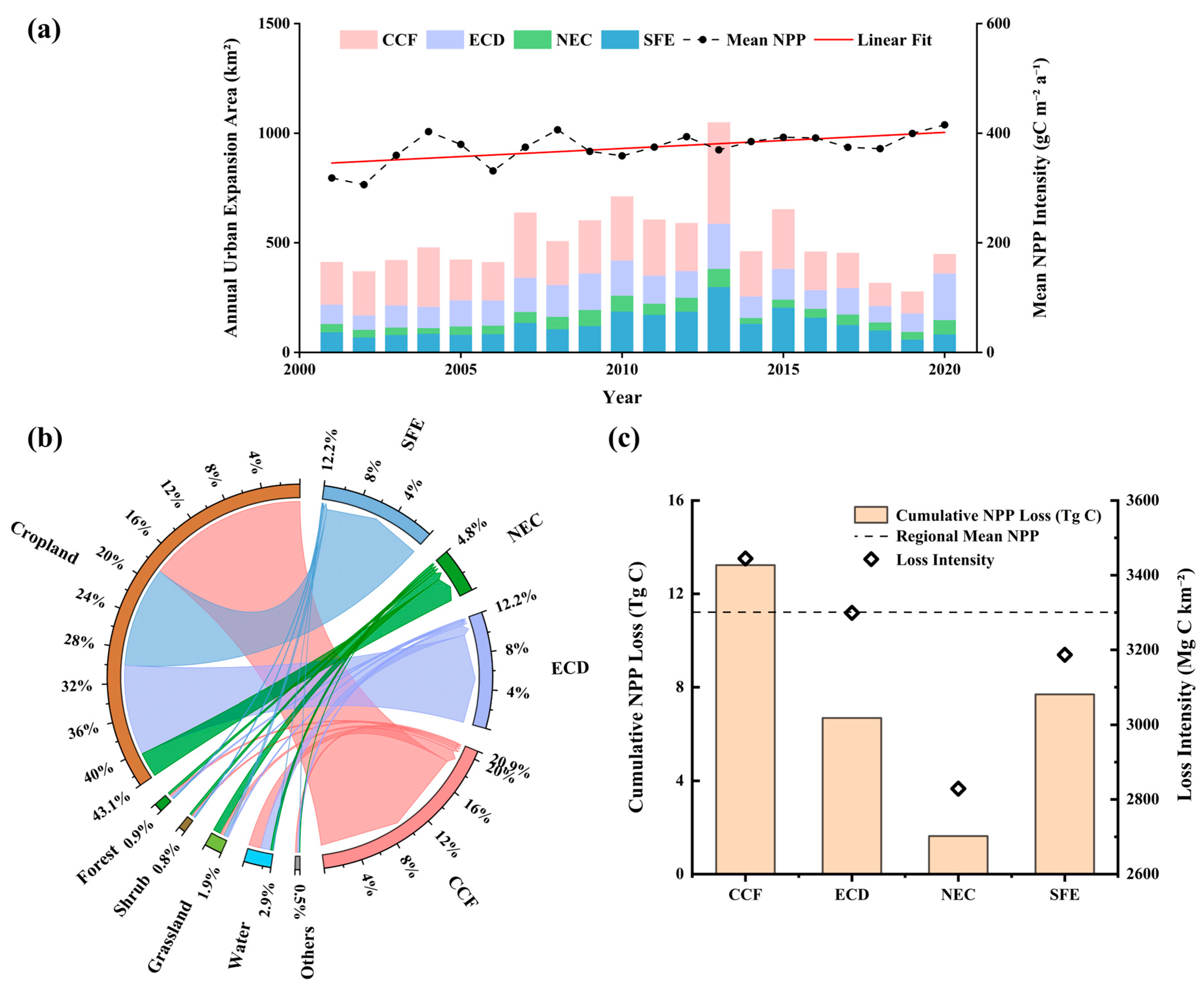 - Cropland conversion dominates urban growth: 91.04% of newly urbanized land came from cropland, causing a time-weighted cumulative cropland net primary productivity (NPP) loss of 29.24 Tg C.