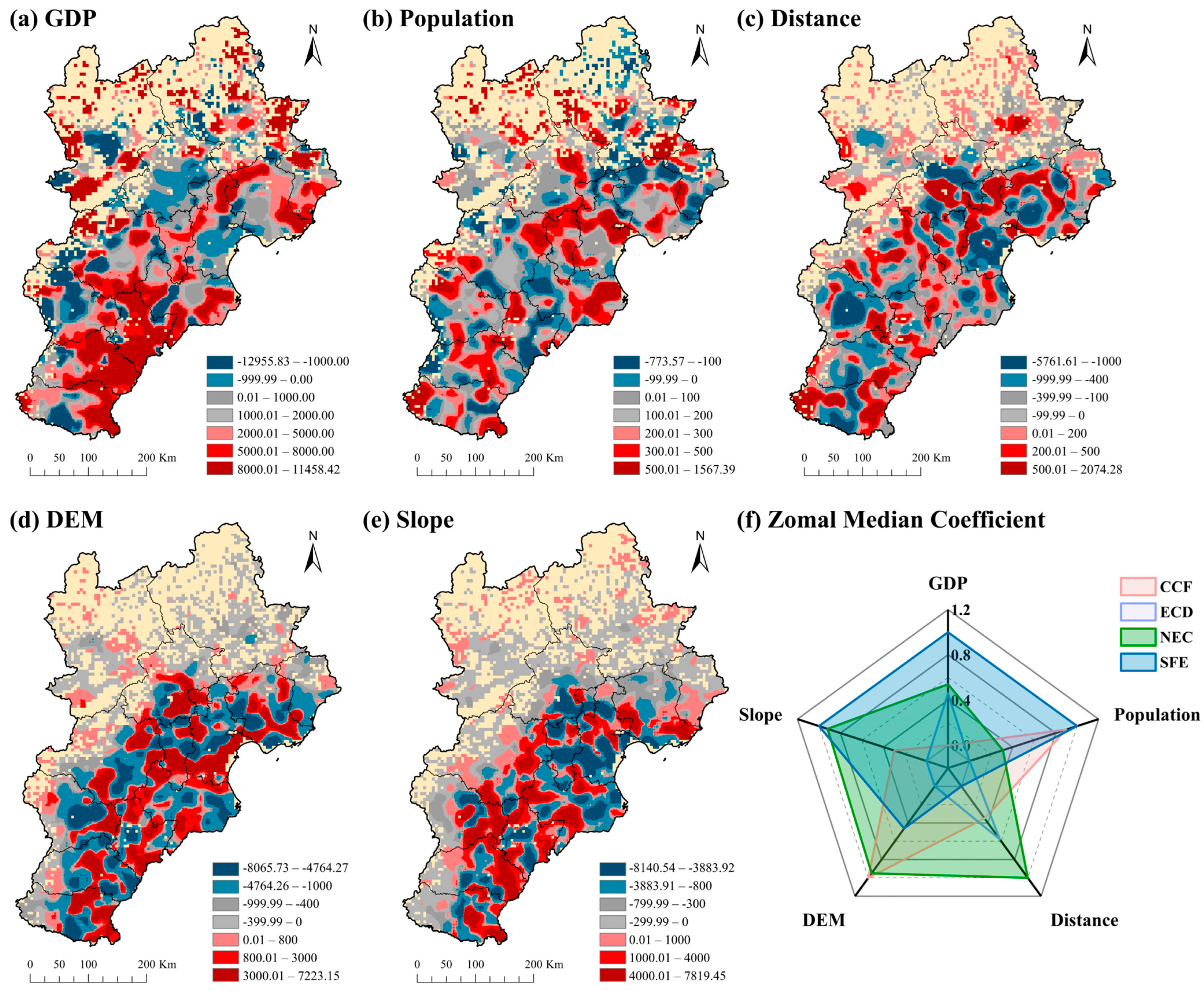2.3.5. Analysis of Driving Factors Using Geographically Weighted Regression