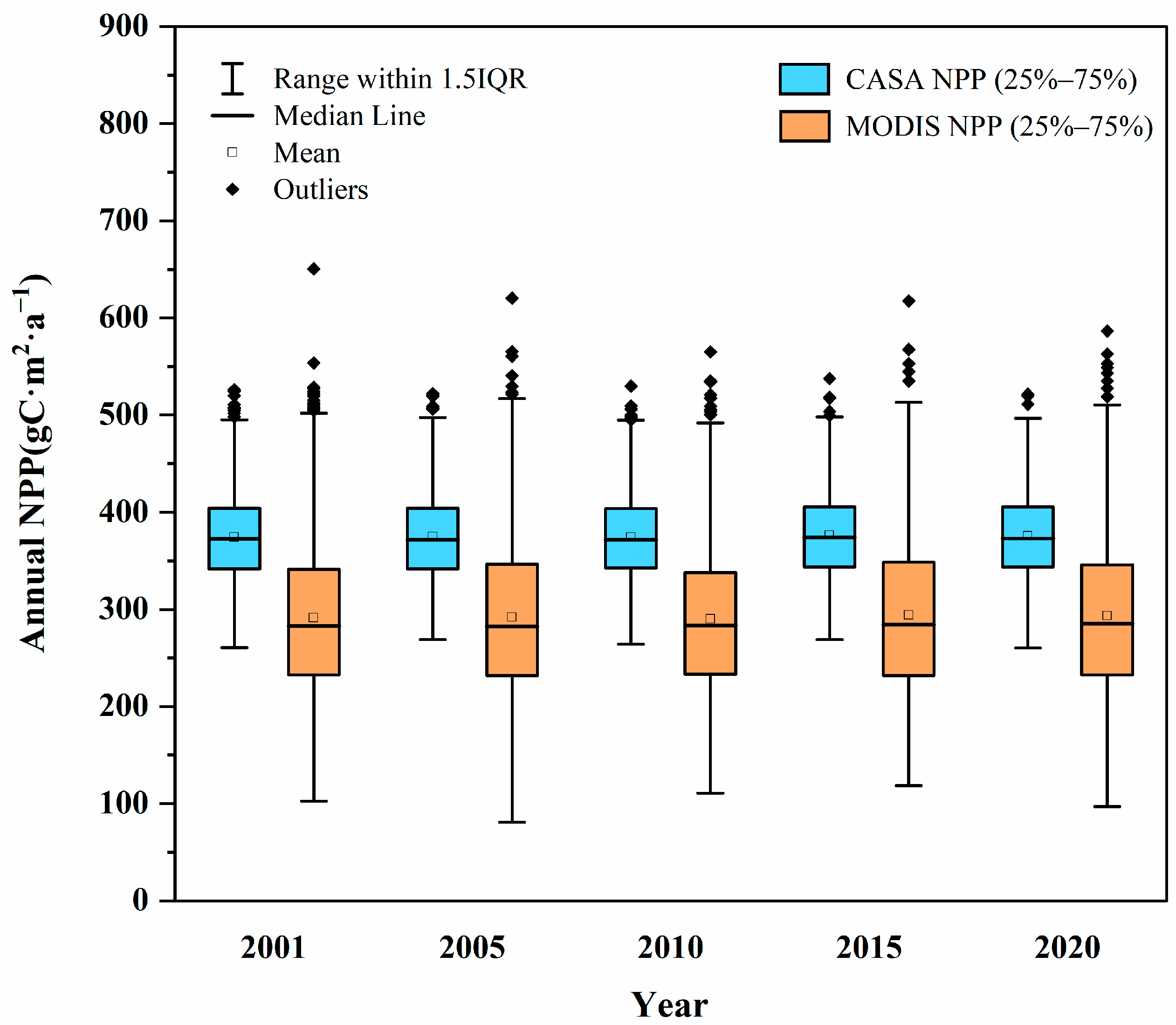 - Zhang, Z.; Huo, L.; Su, Y.; Shen, H.; Yang, G. Estimation of Corn Net Primary Productivity and Carbon Sequestration Based on the CASA Model: A Case Study of the Fen River Basin. Sustainability 2024, 16, 2942. [Google Scholar] [CrossRef]