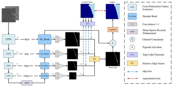 To strengthen the modeling of inter-channel semantic dependencies, a Cross-Polarization Channel Interaction module is introduced into the encoder. This module employs a grouped, staged interaction strategy: first, group-level feature enhancement is achieved through cascading convolutions, followed by inter-group cross-fusion. Finally, the interactive features are adaptively integrated to output enhanced features rich in complementary bipolar information. Furthermore, a Dense–Sparse Diversity Enhancement (DSDE) module is embedded at the bottleneck layer, where multi-scale dilated convolutions and a joint spatial-channel attention mechanism collaboratively model global context and spatial relationships, leading to further optimization of feature representation quality. The high-level features extracted by the encoder are then transmitted to the decoder via skip connections and fused with shallow-level detail features, enabling the progressive recovery of semantic information. To further improve the model’s capability in characterizing complex ice–water boundaries and contours, a multi-scale edge detection branch is introduced at the decoder stage. The output of each decoder layer is projected into an edge map ; then, the edge maps are input into the Selective Edge Fusion (SEF) module. The SEF module employs an adaptive attention mechanism to perform weighted fusion of multi-scale edge features. The produced edge-enhanced feature map is then concatenated with the semantic features from the final decoder output, further improving the completeness of boundary representations and sensitivity to fine-grained details. The edge map generation is supervised by an edge loss computed against the ground truth edge label, which is derived by applying morphological dilation and erosion operations to the segmentation labels.