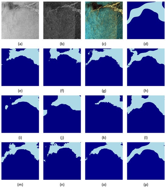 Visualization results of different methods on the AI4Arctic dataset, sample acquired on 30 March 2019 from the South West Greenland region. (a) Original SAR image (HH). (b) Original SAR image (HV). (c) SAR pseudo-color image (R channel: HH, G channel: HV, B channel: average of HH and HV). (d) Ground truth segmentation map (dark blue for open water, light blue for sea ice), (e) CMLFormer, (f) CMTFNet, (g) DeepLabv3+, (h) HRNet, (i) MsanlfNet, (j) SwinUNet, (k) SegFormer, (l) TransUNet, (m) UNet, (n) SRCBTFusion, (o) MMSeaIceUNet, and (p) PFEE-UNet (Ours).