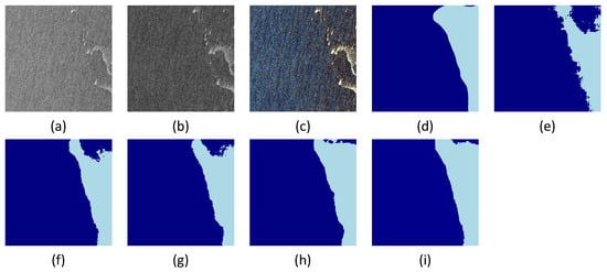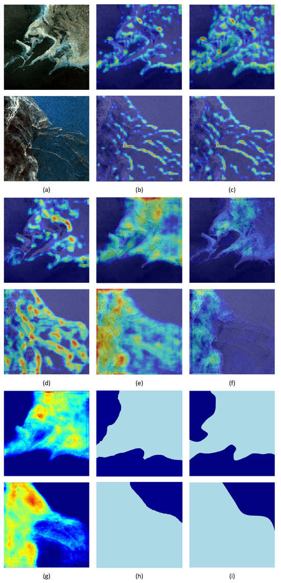 Furthermore, the SEF module employs a Selective Edge Fusion strategy, effectively leveraging multi-scale edge features to enhance the model’s boundary recognition capability. This approach mitigates common issues in sea ice segmentation, such as blurred or discontinuous edges, resulting in final segmentation outputs with significantly improved boundary clarity and contour integrity (see Figure 8i), thereby validating the effectiveness of the SEF module.