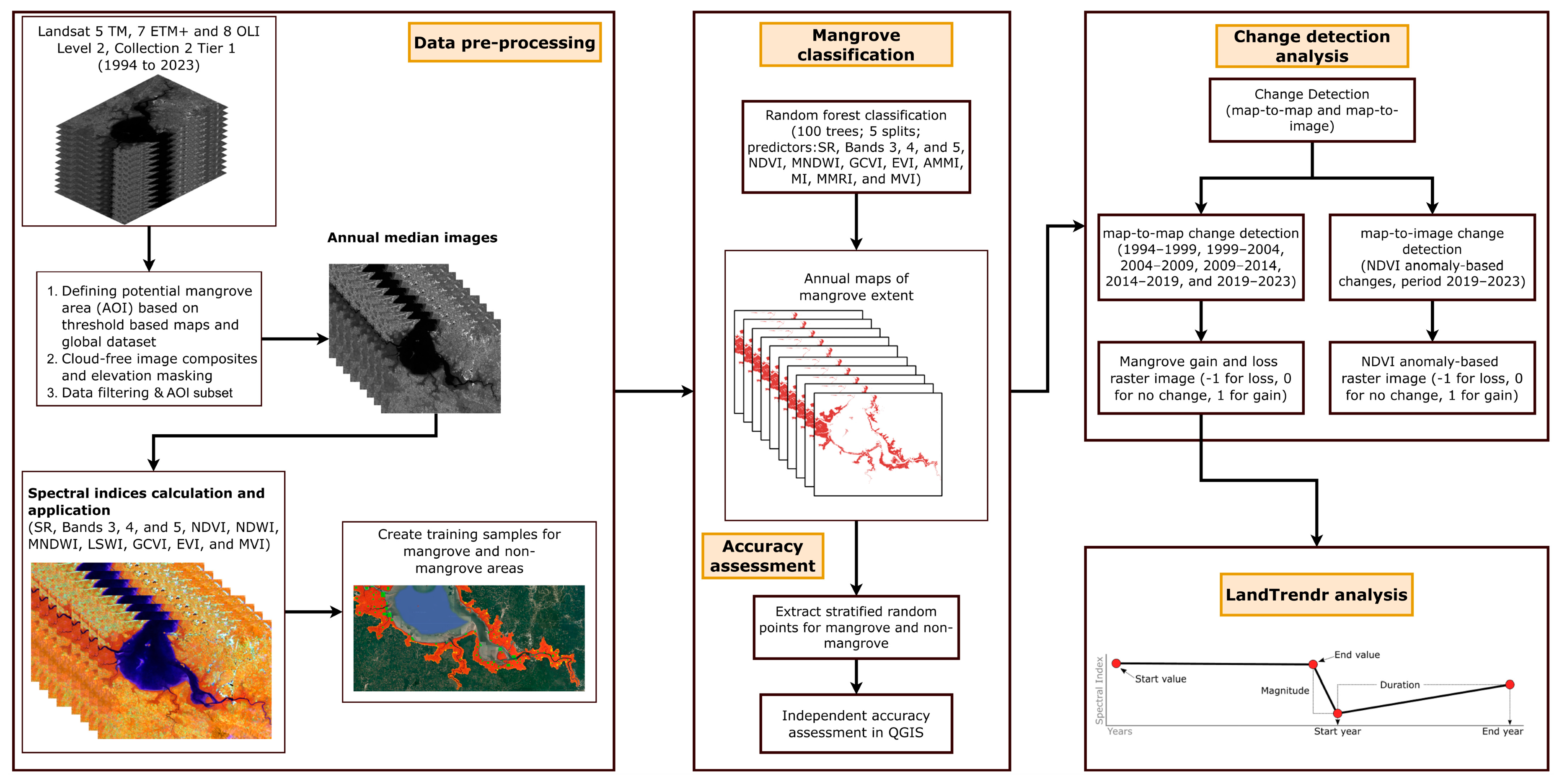 69]. Furthermore, combining RF with other methods or indices, such as the MVI, MMRI, elevation data, and knowledge-based approaches, has been shown to improve the detection of mangrove changes, highlighting the benefits of integrating RF classification with additional spectral indices and auxiliary data [
