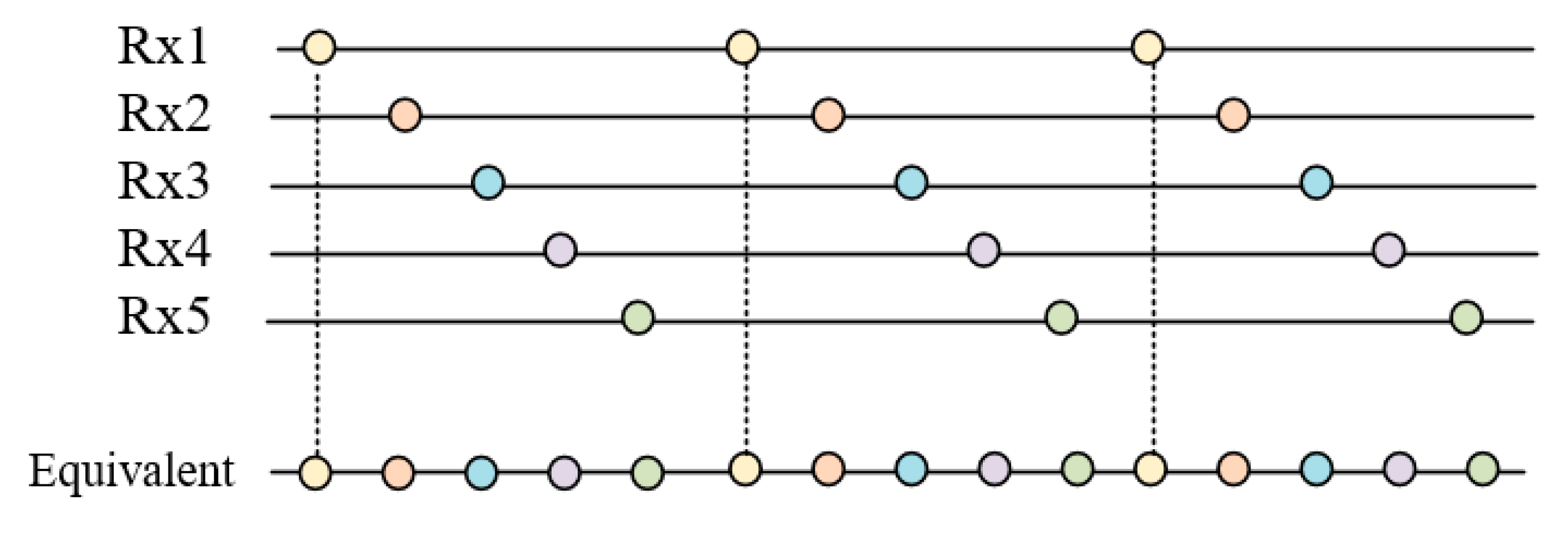 To ensure an unambiguous wide swath imaging scene in the range direction, the AMC SAL system transmits signals at a lower PRF. Consequently, the azimuth sampling rate of the signal received by each channel is insufficient, as illustrated by the individual channel rows in Figure 2. If the platform velocity v s , system PRF f p , and the distance between adjacent channels d meet certain conditions, sufficient spatial sampling will effectively compensate for insufficient time sampling. This can be achieved by processing the data received from N channels in the ordered arrangement, as demonstrated by the equivalent sampling at the bottom of Figure 2. This condition is known as the uniform sampling condition [25], i.e.,