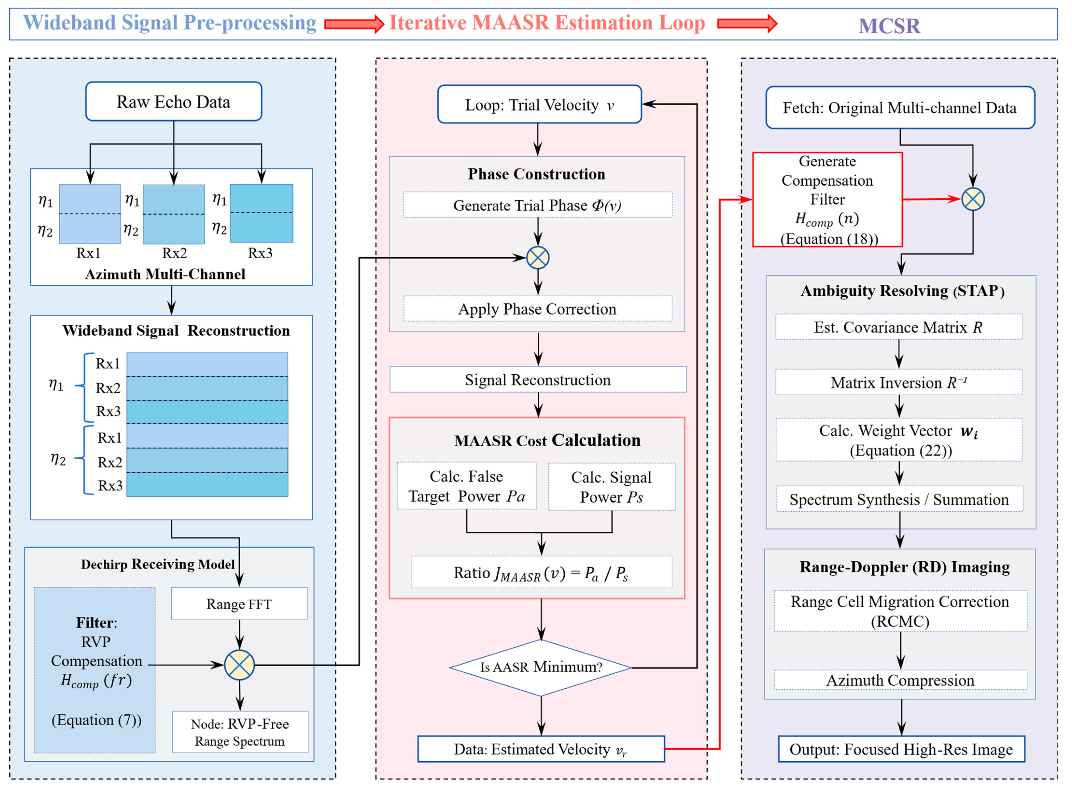 Figure 3. Flowchart of the proposed robust wide-swath SAL imaging framework, integrating RVP compensation, MAASR-based velocity estimation, and MCSR.