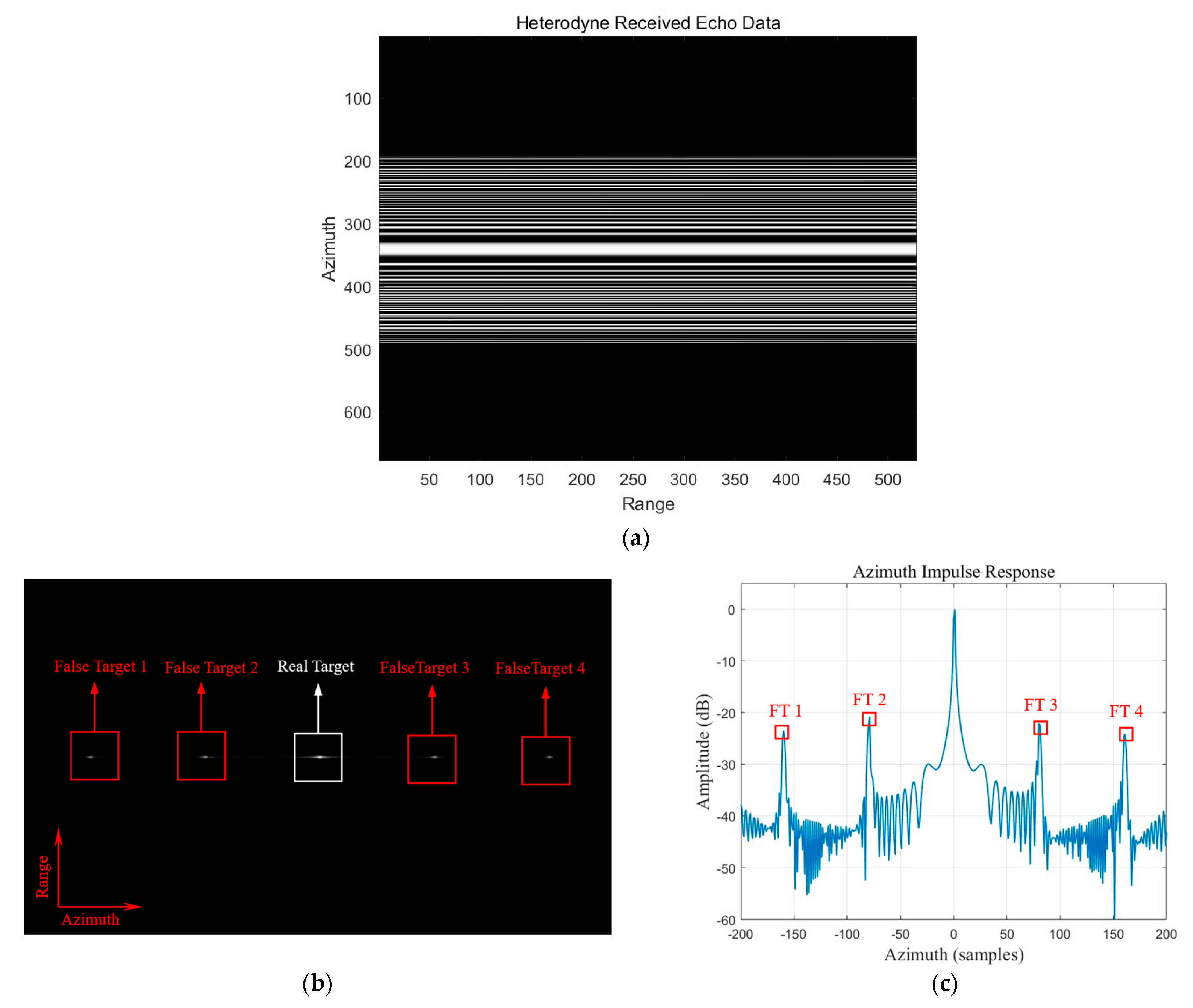 Figure 5. Imaging results of Case B (Non-uniform sampling without reconstruction). (a) Raw heterodyne received echo data in the time domain; (b) 2D Azimuth compress result exhibiting ambiguities; (c) Azimuth ambiguity intensity profile, showing high-level azimuth ambiguities.