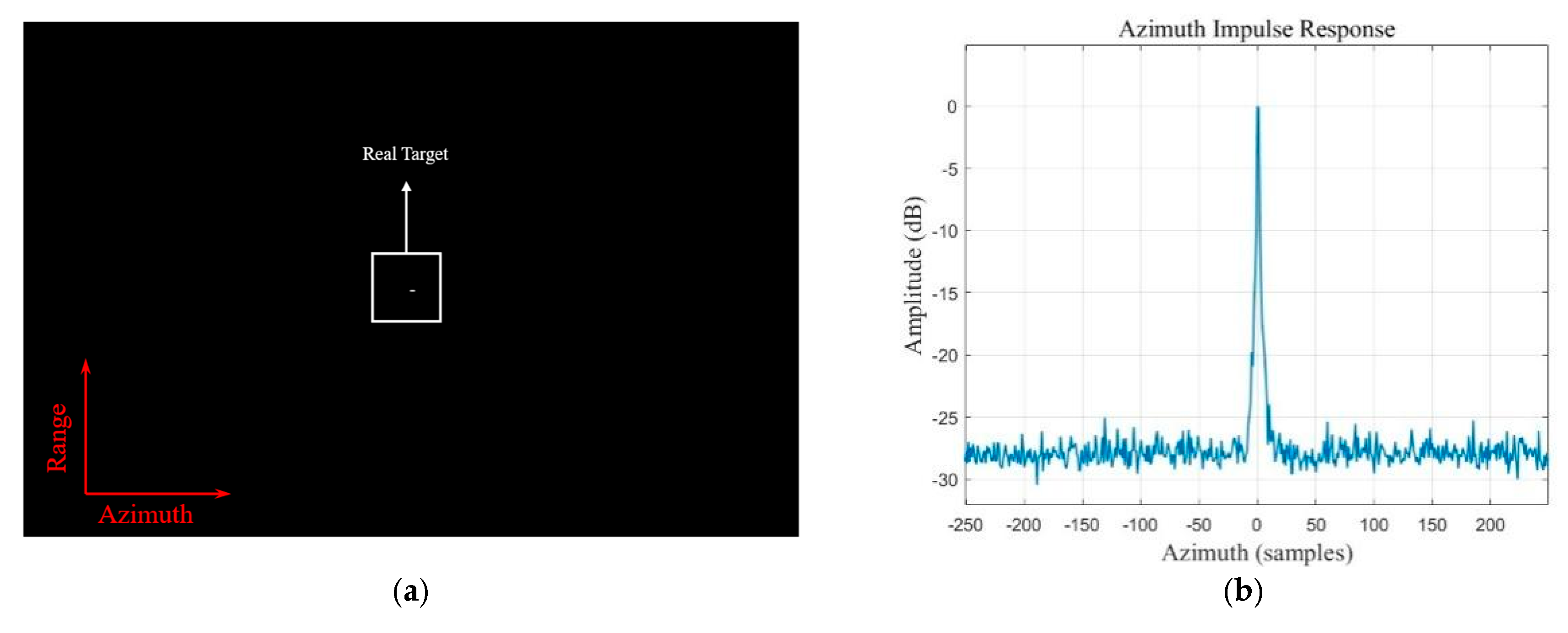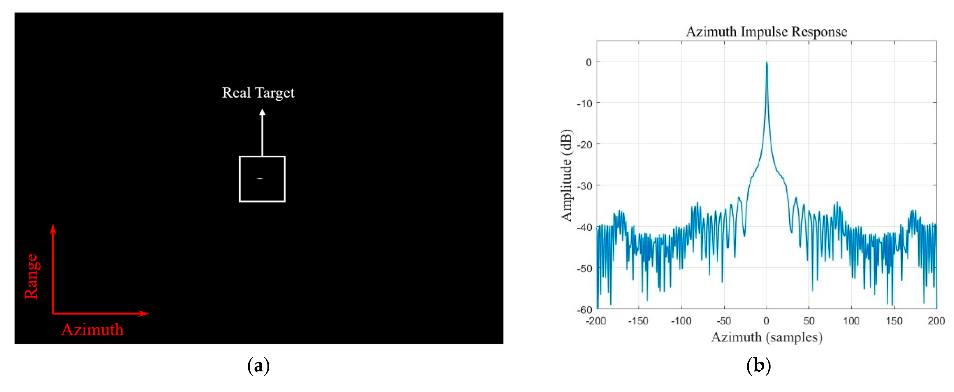Figure 11. Robustness validation under Rayleigh fading noise SNR = 25   dB . (a) Focused 2D image showing high coherent processing gain (bright spot); (b) Azimuth impulse response showing that ambiguous targets remain suppressed below the noise floor.