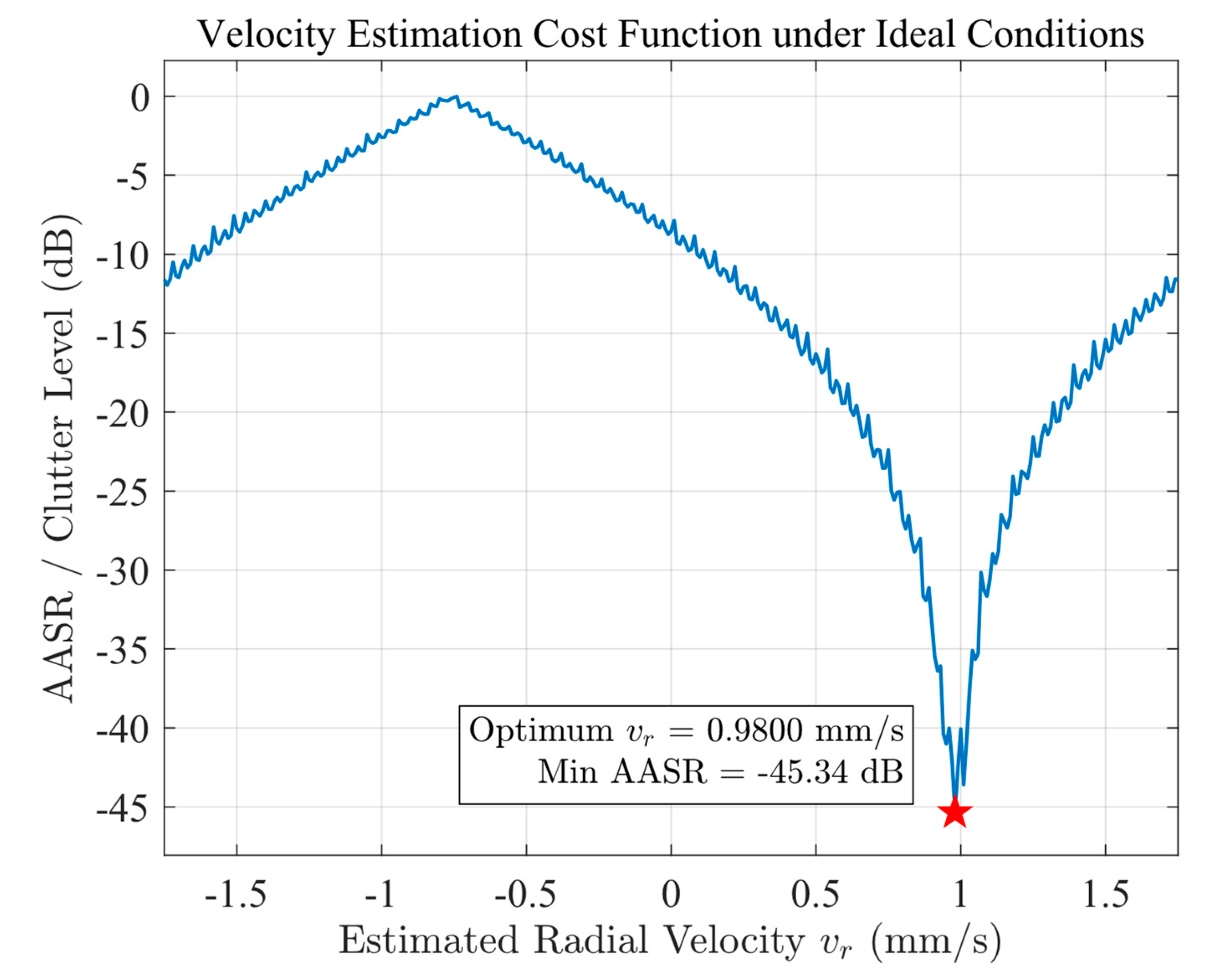 Figure 10. The velocity estimation cost function under noise conditions (SNR = 25 dB). The red star indicates the estimated radial velocity corresponding to the MAASR.