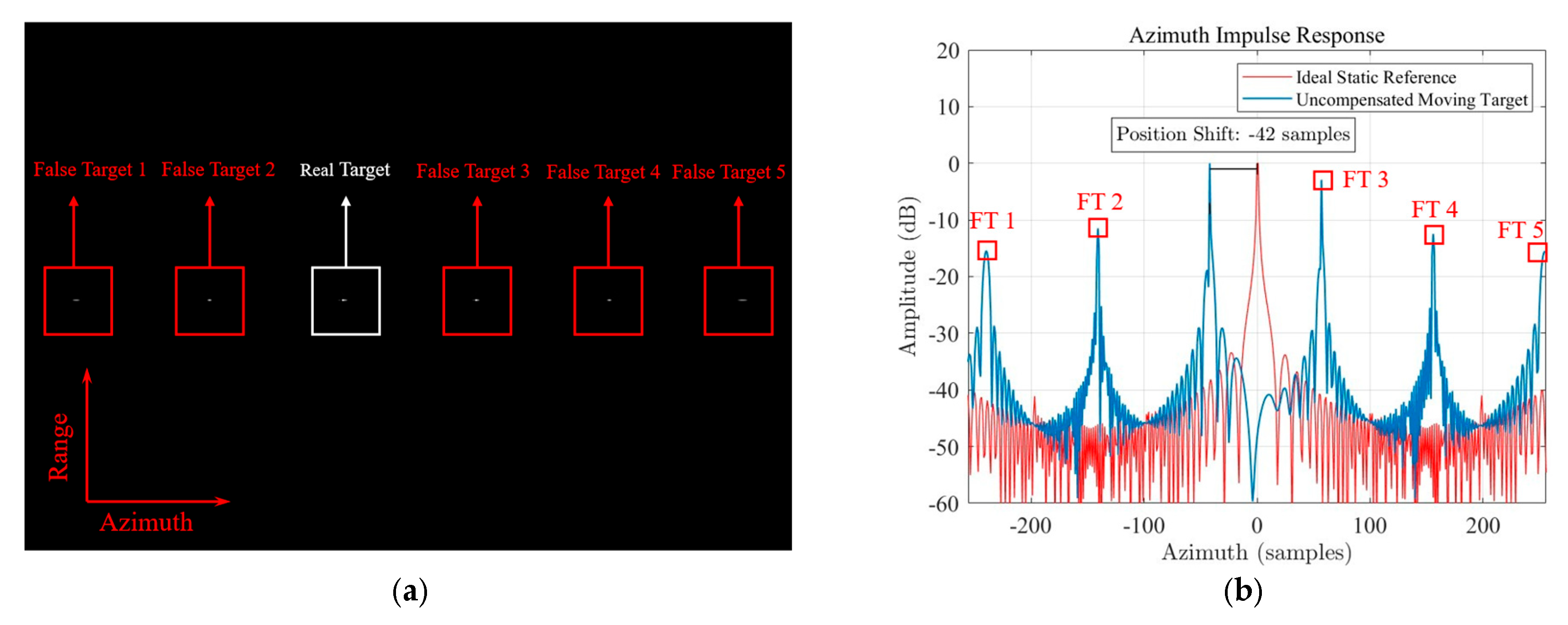Figure 8. Imaging quality comparison of the moving target ( v r   =   1   mm/s ) in a noise-free environment. (a) 2D Azimuth compress result exhibiting ambiguities; (b) Azimuth impulse response comparison.