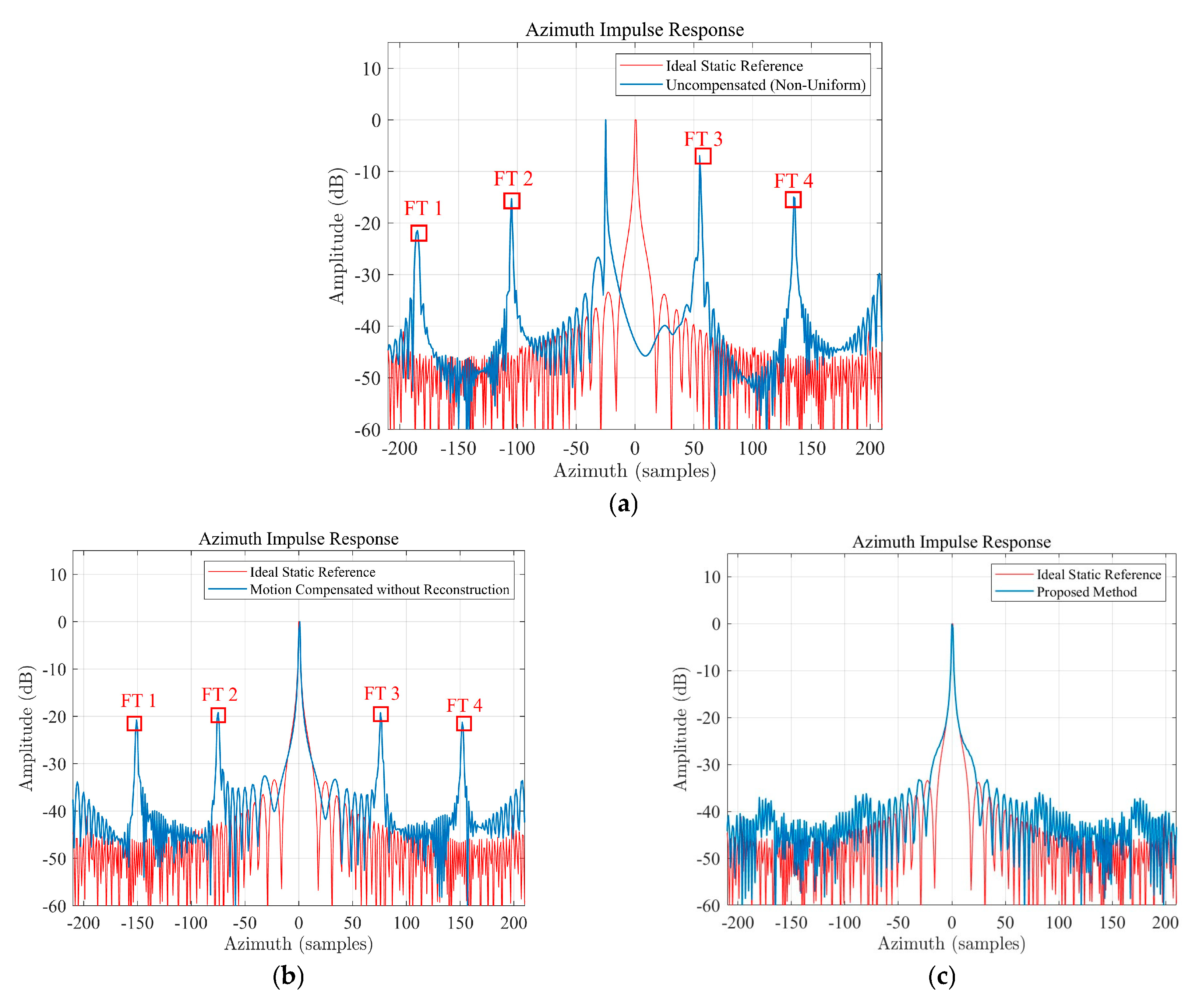 Figure 9. Imaging quality comparison of the moving target under non-uniform sampling conditions. (a) Azimuth impulse response of the uncompensated target; (b) Azimuth impulse response with only motion compensation; (c) Azimuth impulse response of the proposed method.