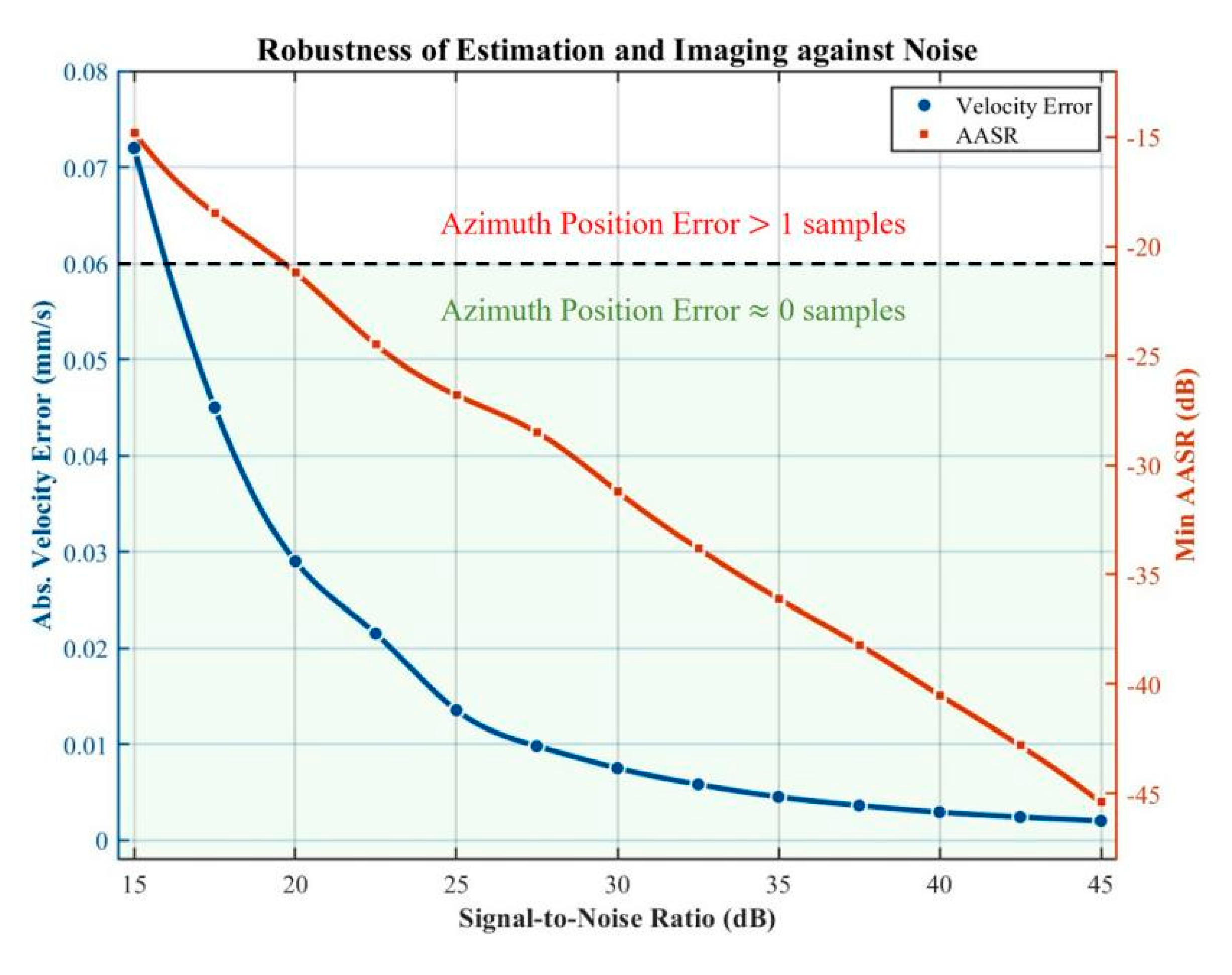 Unlike microwave SAR, SAL is extremely sensitive to velocity mismatches. Any deviation triggers a sharp rise in azimuth ambiguities. To quantify the level of ambiguity, the Azimuth Ambiguity-to-Signal Ratio (AASR) is utilized. The AASR is mathematically defined as: