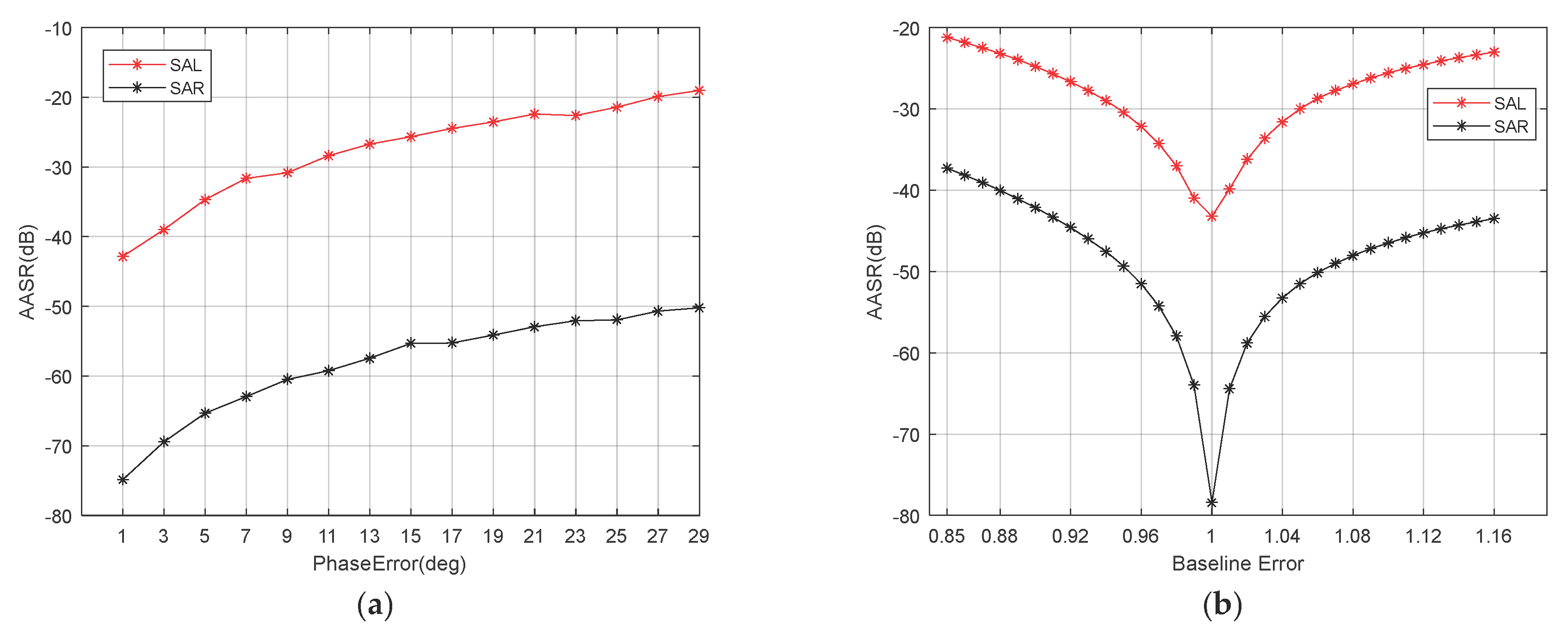 Figure 13. (a) The impact of phase error on the image quality of the AMC SAR and the AMC SAL; (b) The impact of baseline error on the image quality of the AMC SAR and the AMC SAL.