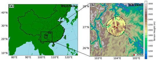 Nested-grid simulation domains (a) and terrain height over the finest-grid domain containing the Weining region (b). The locations of three XPARs are marked by the red dots.