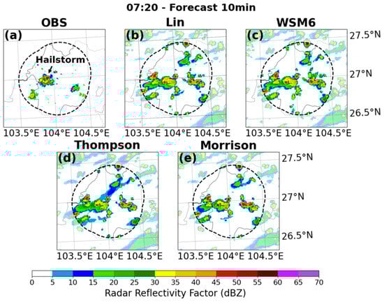 Composite radar reflectivity of the observation (a) and the 10-min forecasts of with the Lin scheme (b); the WSM6 scheme (c); the Thompson scheme (d); and the Morrison scheme (e) at 07:20 UTC on 17 August 2023.