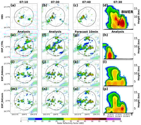 Composite radar reflectivity of (a–d) observations; (e–h) EXP_CTRL without data assimilation; (i–l) EXP_DA6min with 6-min assimilation intervals; (m–p) EXP_DA1min with 1-min assimilation intervals from 07:10 to 07:40 UTC on 17 August 2023. The line AB in (b,f,j,n) marks the locations of the vertical cross-sections shown in (d,h,l,p). The dashed contour marks the measurement range of the XPAR radar network at Weining.