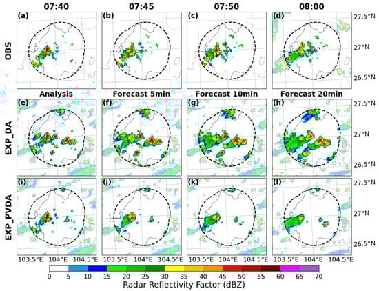 Composite radar reflectivity factor of observations (a–d); EXP_DA (without humidity adjustment) (e–h); (i–l) EXP_PVDA (with moisture adjustment) (e–h) from 07:40 UTC to 08:00 UTC on 17 August 2023. The line AB in (a,e,i) and line CD (c,g,k) marks the locations of the vertical cross-sections shown in Figure 7.