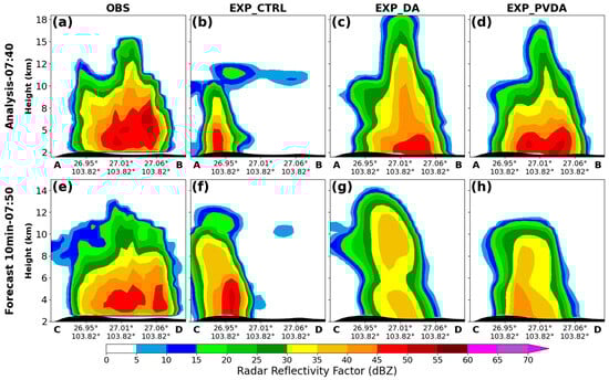 Vertical cross-sections along lines AB and CD in Figure 7 of radar reflectivity factors for observations (a,e), and EXP_CTRL (b,f), EXP_DA (c,g), and EXP_PVDA (d,h) at 07:40 to 07:50 UTC on 17 August 2023.