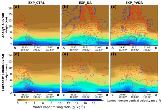 Vertical cross-sections (along line AB and CD in Figure 7) of water vaper mixing ratio (colored shade, g kg−1) and vertical velocity (red and blue contours for updraft and downdraft respectively, m s−1) for EXP_CTRL (a,d), EXP_DA (b,e), and EXP_PVDA (c,f) at 07:40 UTC to 07:50 UTC on 17 August 2023.