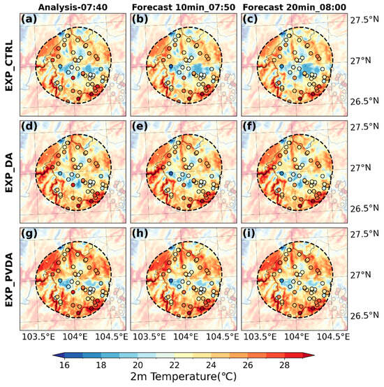 Comparison of 2 m temperature from 07:40 to 08:00 UTC on 17 August 2023: (a–c) experiments without assimilation; (d–f) radar data assimilation experiments without humidity adjustment; (g–i) radar data assimilation experiments with humidity adjustment. Colored dots represent 2 m temperature observations from surface stations.