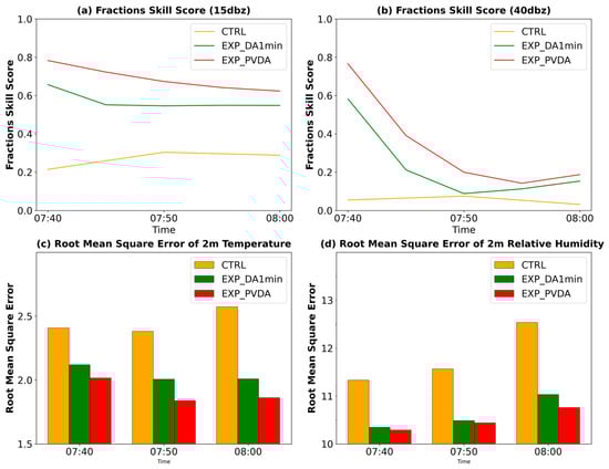 Statistical verification of EXP_PVDA and EXP_DA (both with assimilation of 1-min interval radar data) and EXP_CTRL. FSS of composite radar reflectivity factors at 15 dBZ (a) and 40 dBZ (b) thresholds; RMSE of 2 m temperature (c) and 2 m relative humidity (d).