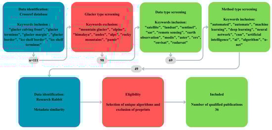 The protocol for this review was created based on the Preferred Reporting Items for Systematic reviews and Meta-Analyses extension for Scoping Reviews (PRISMA-ScR) [26]. This research was preregistered on the Open Science Framework portal under the same title as the manuscript [27]. Our review combines the information from all peer-reviewed articles published until November 2025. We have considered all reports found in the the Crossref database through keyword queries. The initial search was conducted with a Crossref API, where ”glacier calving front“, ”glacier terminus“, and other phrases were searched for in titles, keywords, and abstracts. Results with a unique DOI identifier were then filtered to exclude all works regarding mountain glaciers. From the resulting pool, only works using satellite data were selected, and only those with any form of automation remained. After the initial search, we used a Research Rabbit AI tool [28] for further suggestions of articles, all carefully evaluated. The exact keyword sets and number of results are presented on the flow diagram in Figure 1. All remaining articles were carefully analyzed by two reviewers and charted based on the following variables: