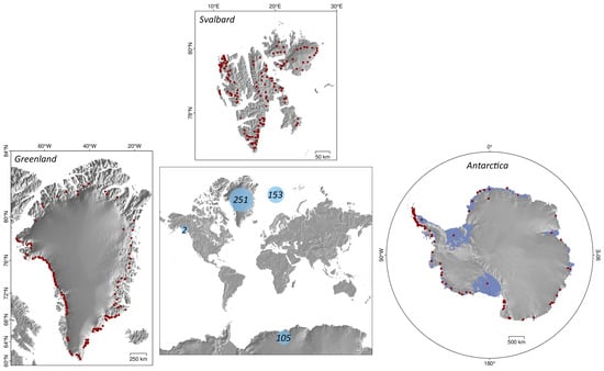 Distribution of all glaciers studied across all found relevant sources. In the center, the numbers in green circles represent the cumulative count of studied glaciers, grouped by region. The above, right, and left panels present three main regions, with red dots representing centroids of all glaciers processed by the described algorithms.