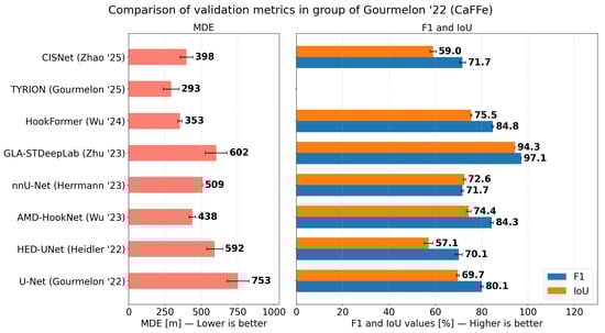 In contrast to strict definitions and formulas used for and metrics, the mean distance error () was calculated differently between studies. The can be calculated as the mean distance between the pixels of the predicted CF and a label [3,18,31].