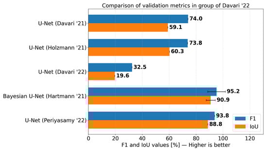 Subsequent work by Hartmann et al. [66] was dedicated to the assessment of uncertainty in the output of the U-Net and its incorporation as a focus mechanism for a second U-Net. Again, the basis for this experiment is a U-Net proposed by Zhang et al. [20]; however, in this case, dropout layers with a relatively high rate of 50% are applied after each block, except the last. The modified network is called Bayesian U-Net after [71]. Each input is processed 20 times, which, paired with a random dropout of weights in each block, acts as a Monte Carlo simulation framework. The pixel-wise variance of errors is calculated to produce the uncertainty map, which is then binarized by a threshold of 0.125 and stacked with a raw image, creating a 2-band input for a second identical Bayesian U-Net. However, this time, the results were averaged to produce the final segmentation output. Hartmann et al. [66] used exactly the same dataset as in Holzmann et al. [65], but their algorithm performed zone segmentation rather than edge segmentation. Therefore, the resultant and values were significantly higher and equal to 95.24% and 90.91%, respectively. However, compared with the unmodified U-Net of Zhang et al. [20], the improvements were statistically insignificant (0.38% improvement with a standard deviation of 6.57% for and 0.69% improvement with a standard deviation of 3.40% for ).