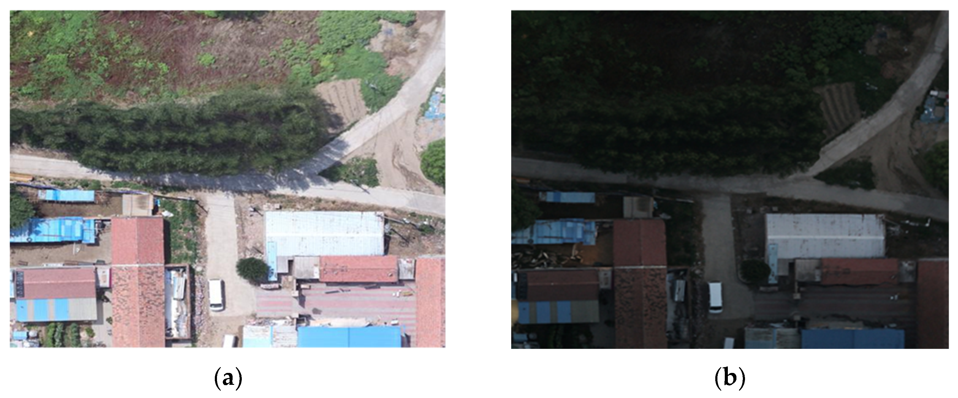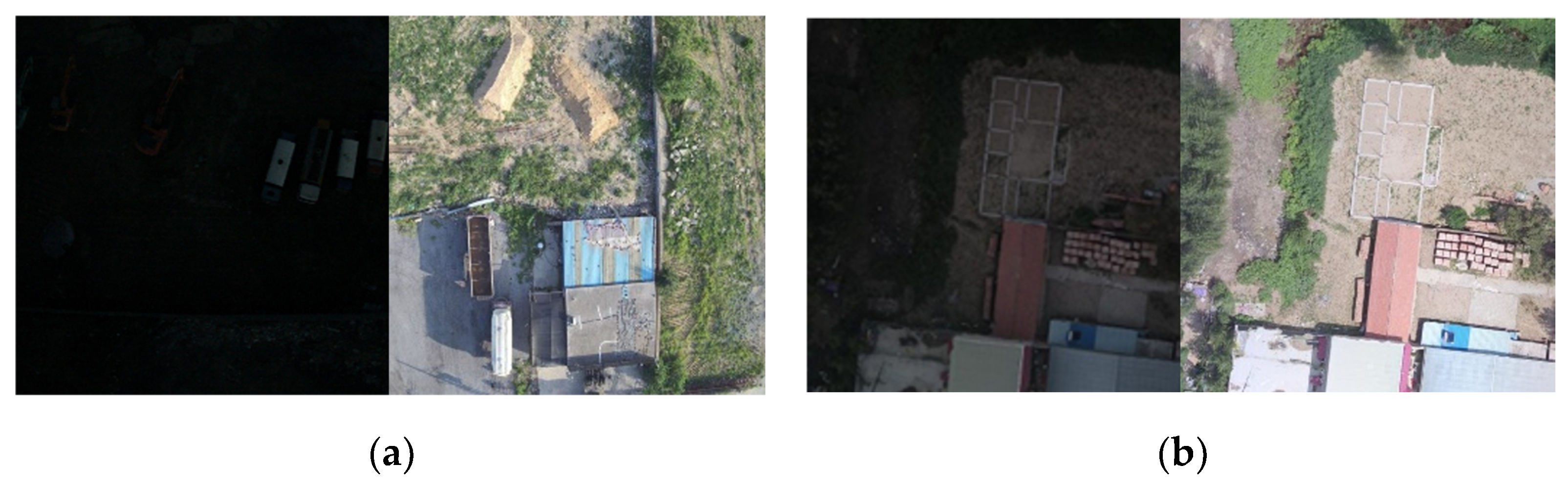 Although these methods can guarantee effective enhancement through explicit mapping relationships, they are extremely difficult to apply to outdoor scenarios. For instance, drones cannot acquire strictly paired data of the same area at different times. Even with post-processing techniques, it is difficult to overcome interference caused by dynamic changes in ground objects (such as moving vehicles and people) and parallax variations caused by different imaging angles when the drone captures the same scene at different times. Manual pixel-level registration and annotation of such image data by professionals would be prohibitively expensive, rendering the construction of large-scale paired datasets infeasible.