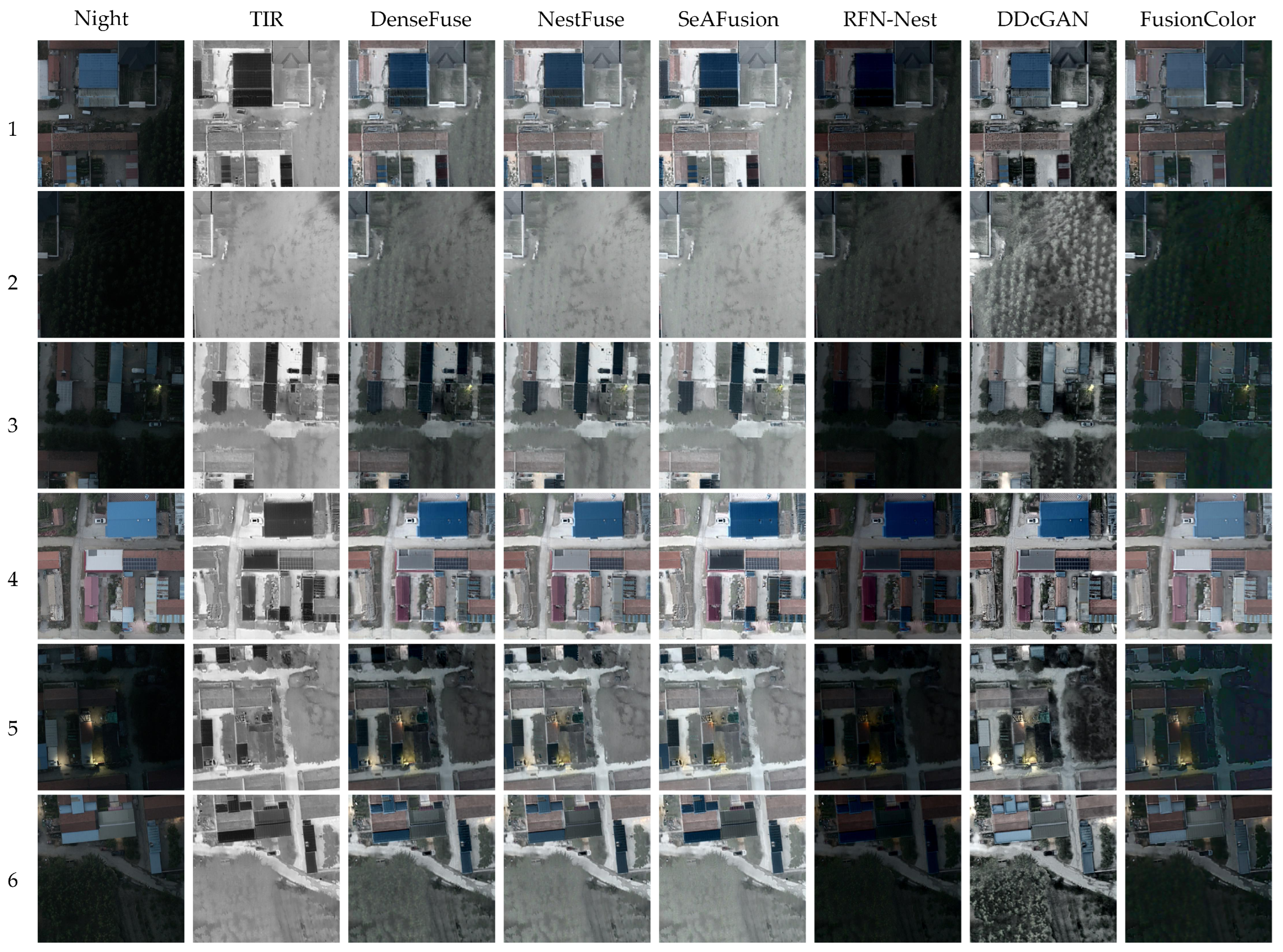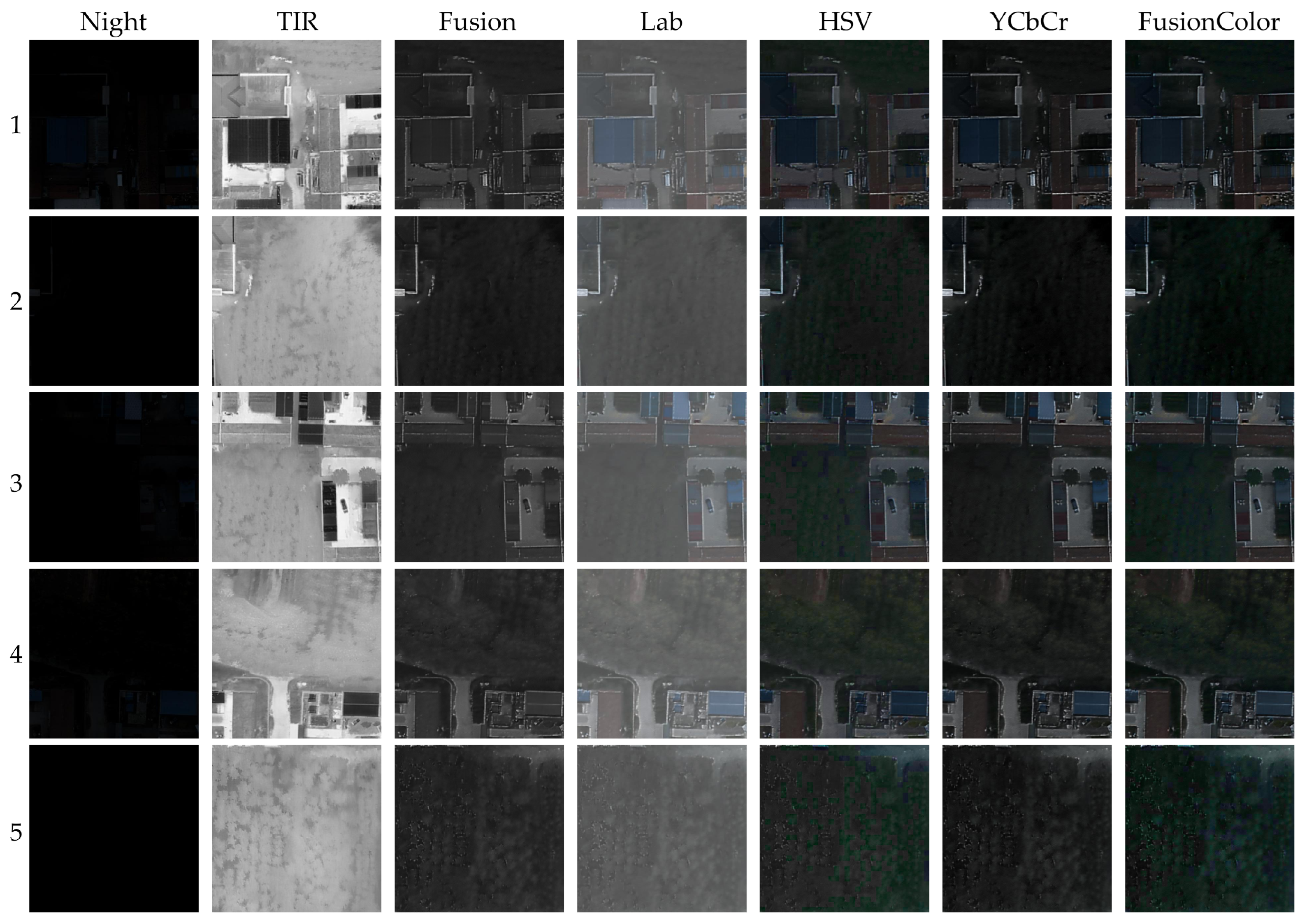 To further verify the applicability of the proposed method in different regional scenes, supplementary experiments are carried out on UAV nighttime image data collected in Hancheng Town, Tangshan City. The dataset contains a total of 220 pairs of image samples, including nighttime color visible (NCV) images, thermal infrared (TIR) images and daytime color visible (DCV) images. Although the data have been registered, there may still be a certain spatial offset between images due to factors such as cross-temporal acquisition and UAV attitude changes. Therefore, this experiment mainly analyzes the enhancement effects of different methods through visual comparison without strict quantitative evaluation.