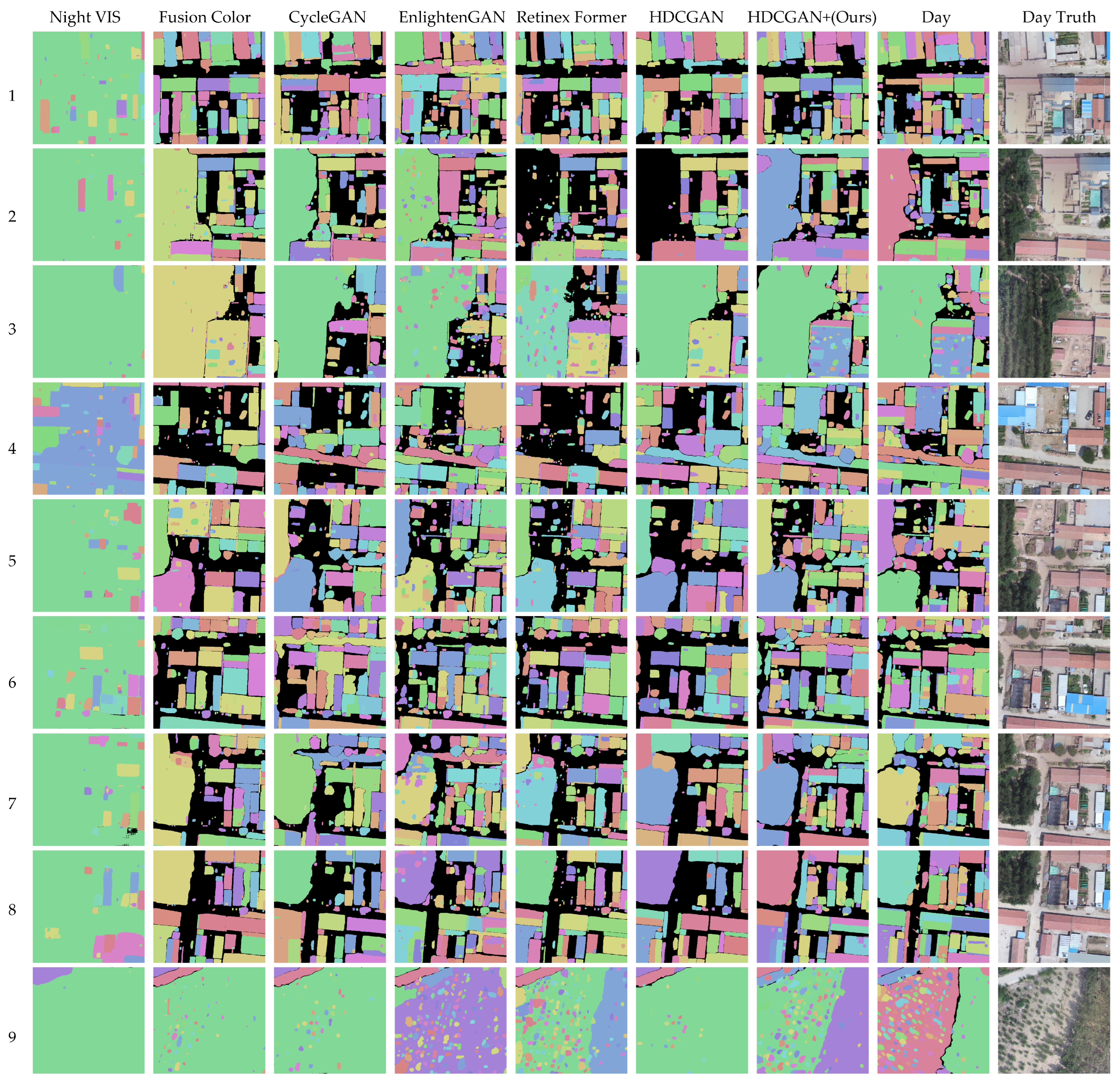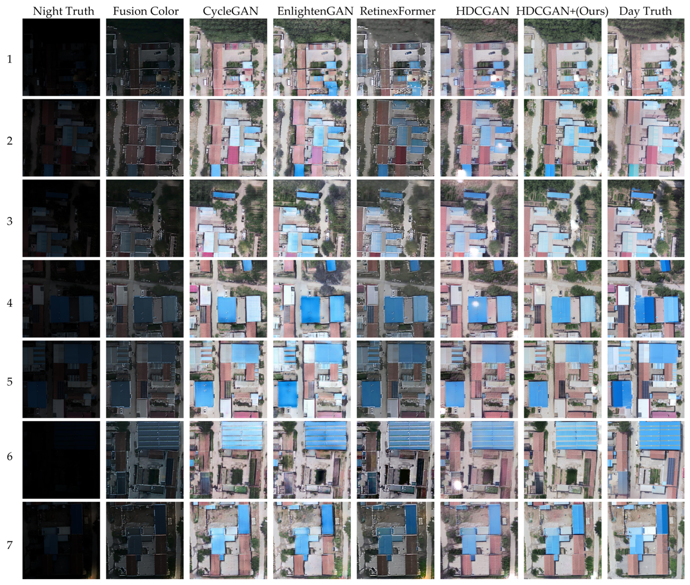 Figure 12 shows the enhancement results of different methods on the Tangshan dataset. From left to right are the enhancement results of FusionColor, CycleGAN, EnlightenGAN, RetinexFormer, HDCGAN, HDCGAN+ and the daytime reference image (Day Truth). From the perspective of human visual judgment, it can be observed that compared with all methods, HDCGAN+ performs more stably in brightness restoration, texture details and structure retention, and its results are visually closer to the daytime reference image, indicating that the proposed method has good transfer ability under cross-regional data conditions.