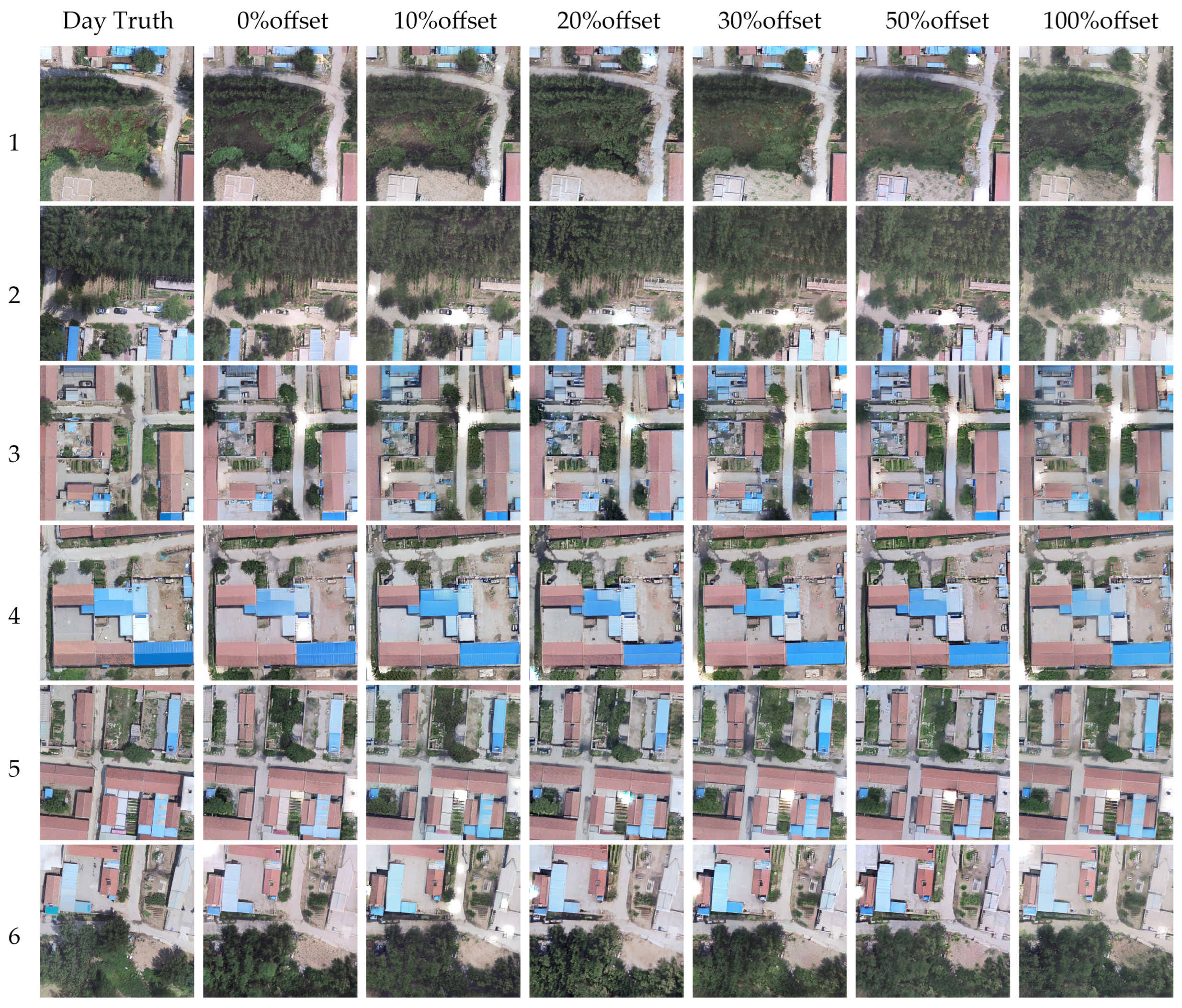 Figure 10 shows the enhancement results under different offset ratios. From left to right in the figure are the daytime reference image and the enhancement results obtained under the offset ratios of 0%, 10%, 20%, 30%, 50% and 100%. Overall, as the spatial overlap between images decreases, the quality of enhanced images gradually decreases. When the offset ratio is in the range of 0–30%, the enhanced results can still maintain the main ground object structures and texture details such as roads and buildings well; however, when the offset ratio continues to increase, the structure retention ability is significantly weakened. Especially under the condition of 100% complete non-overlap, due to the lack of effective semantic correspondence, the fidelity and consistency of some building boundaries and road structures become weaker and weaker compared with the Day Truth, and the quality of enhanced images is the worst at this time.