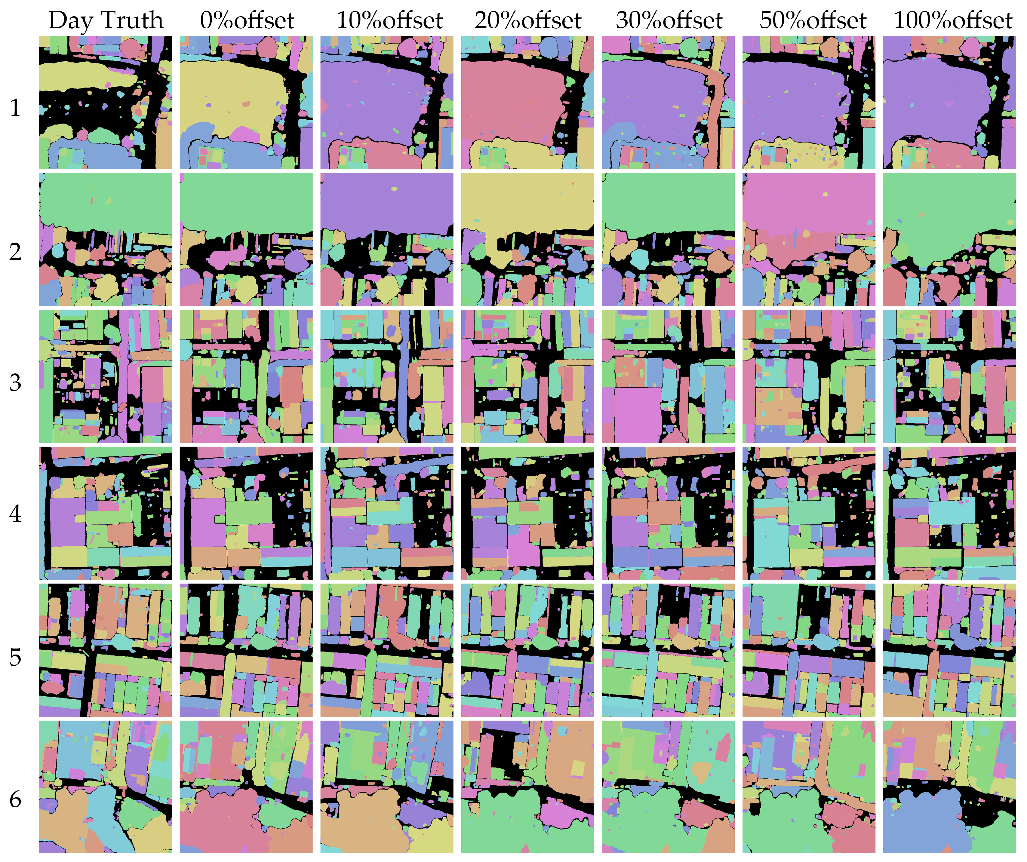 Figure 11. From left to right in the figure are the segmentation results of the daytime reference image, and the segmentation results of enhanced images obtained under the offset ratios of 0%, 10%, 20%, 30%, 50% and 100%.