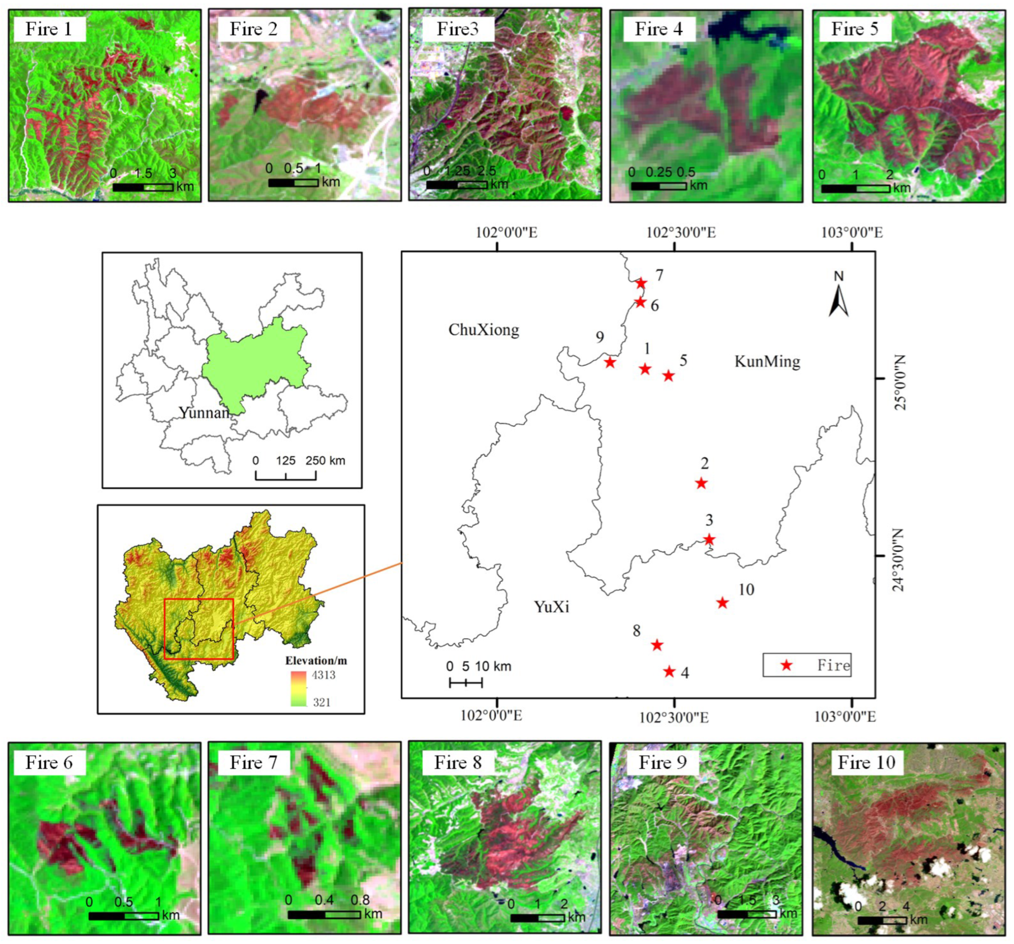- Wu, C.; Xu, W.; Xiao, C.; Wang, Q.; Yuan, H.; Dong, J.; Huang, S.; Xiong, Y. Dynamic change of recovery ratios and influencing factors of typical post-fire burn areas in central Yunnan Province. Resour. Sci. 2021, 43, 2465–2474. [Google Scholar] [CrossRef]