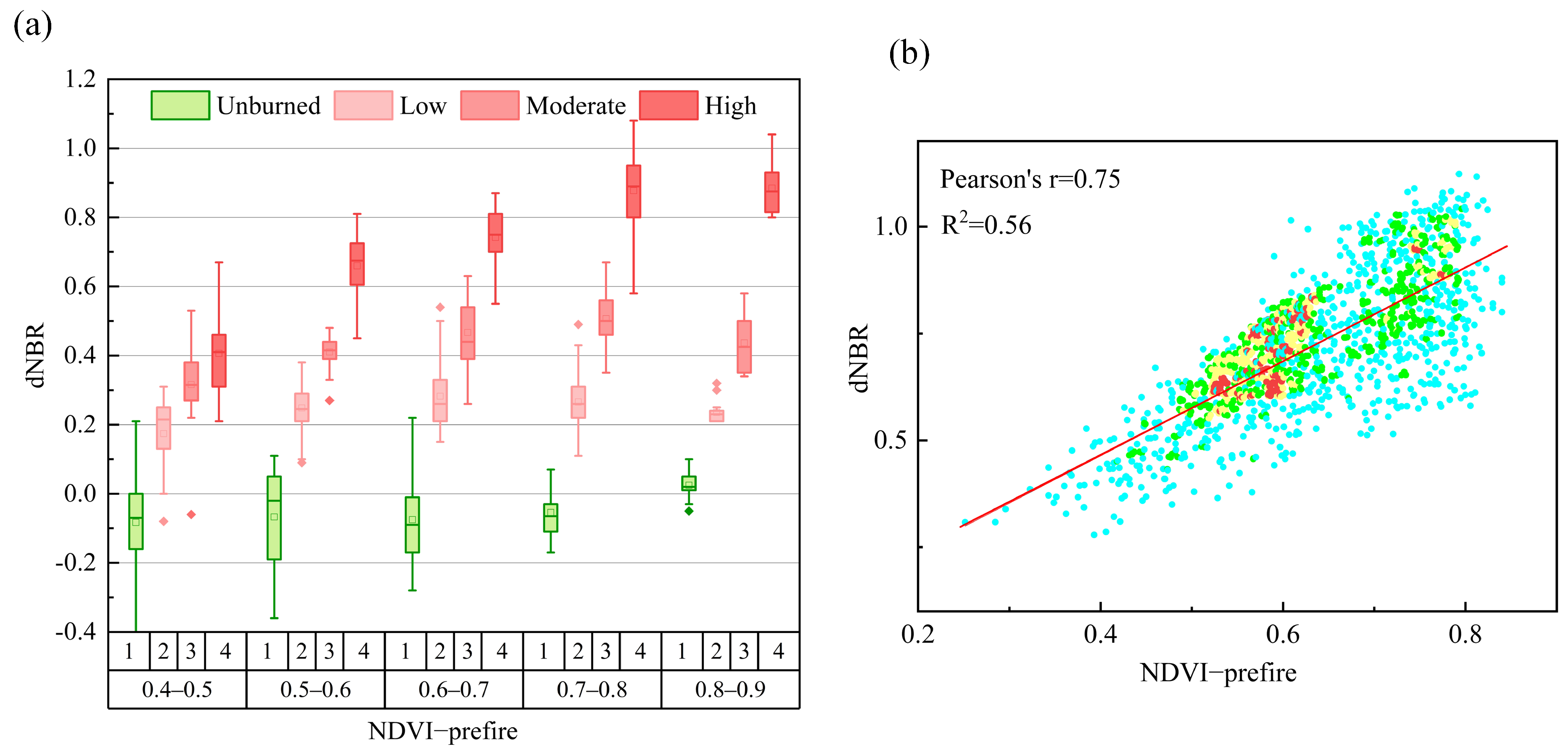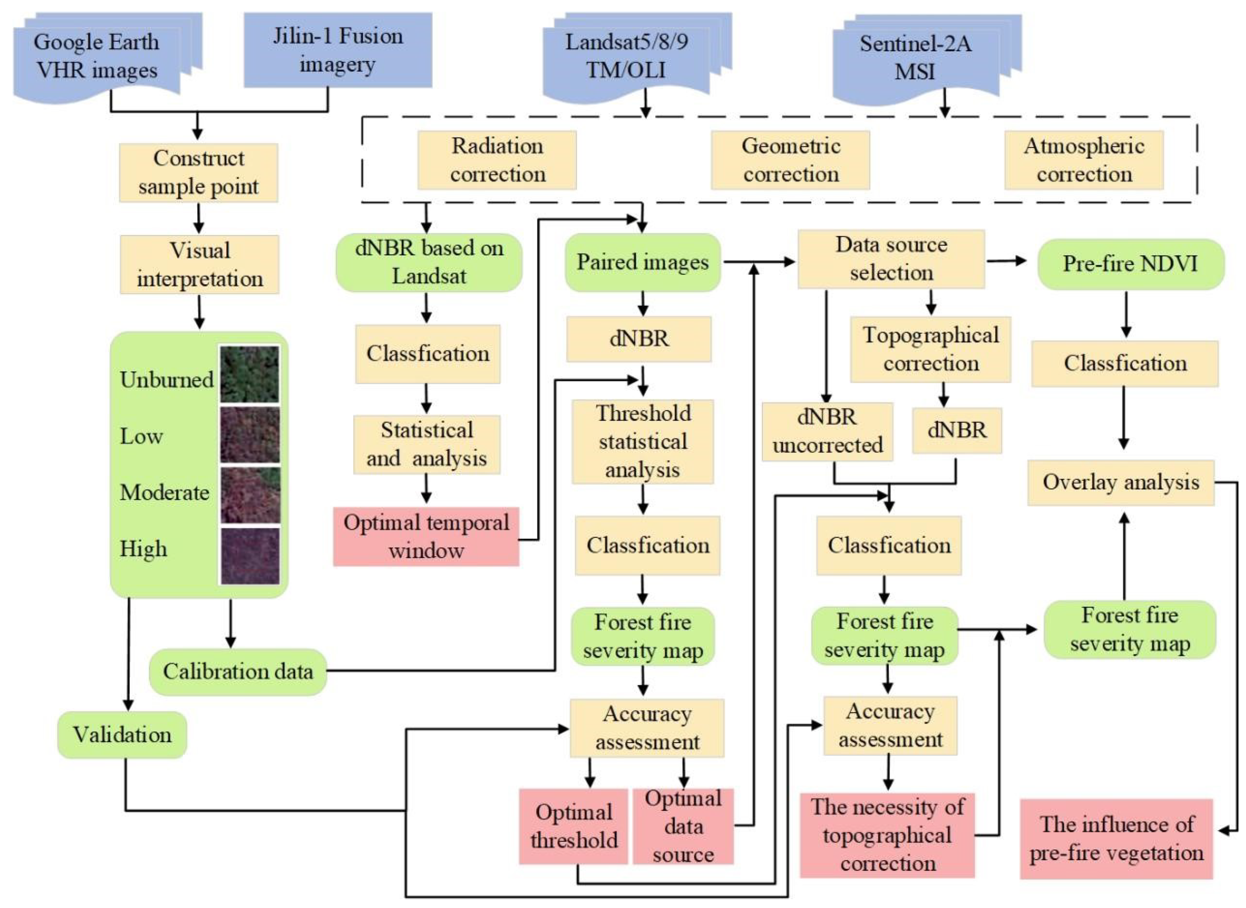 - Topographic correction offered limited practical benefits. Furthermore, dNBR demonstrated reliable applicability primarily in forests with pre-fire NDVI > 0.5.
