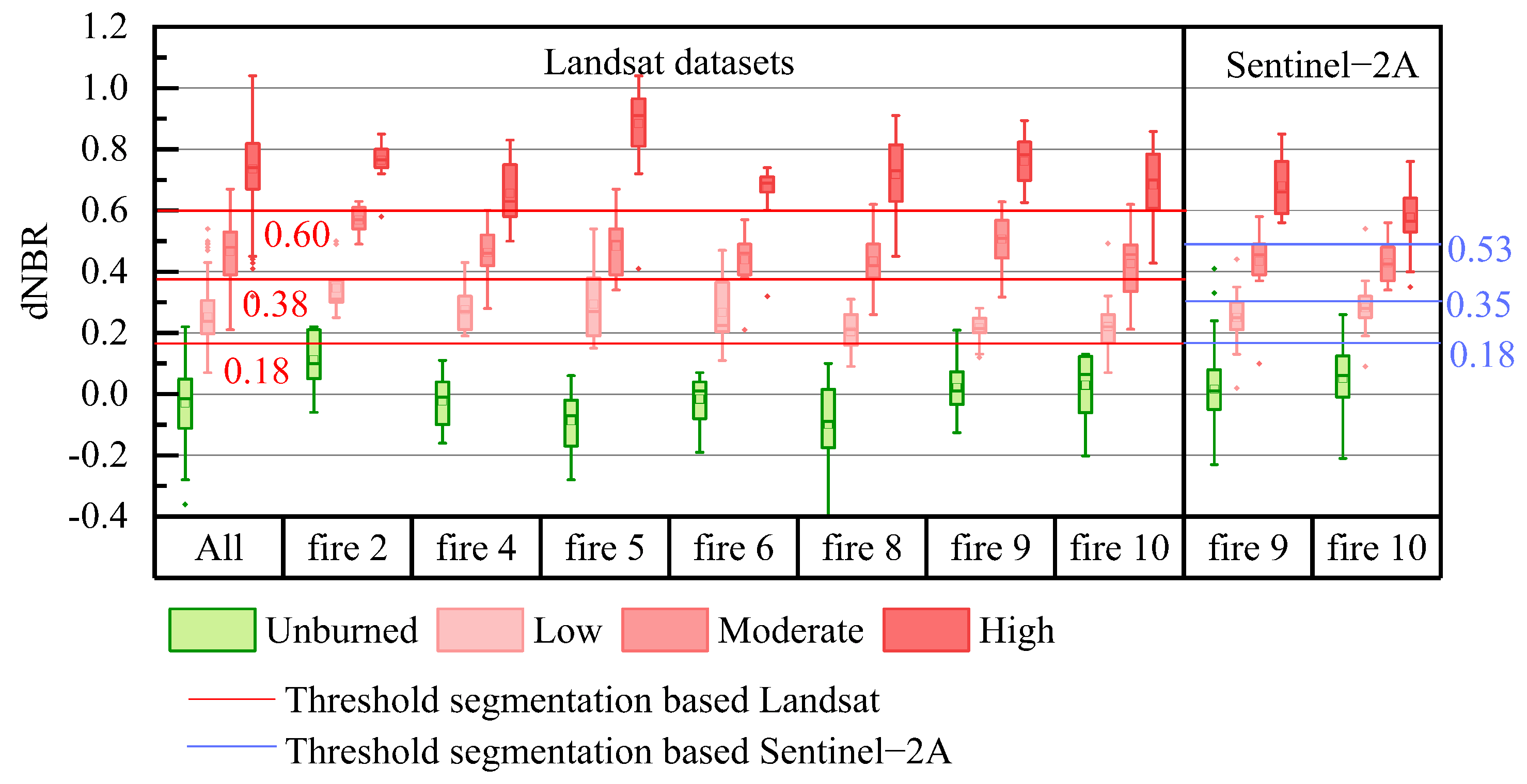 4.2. The Effect of dNBR Calculated from Different Datasets on Forest Fire Severity Assessment