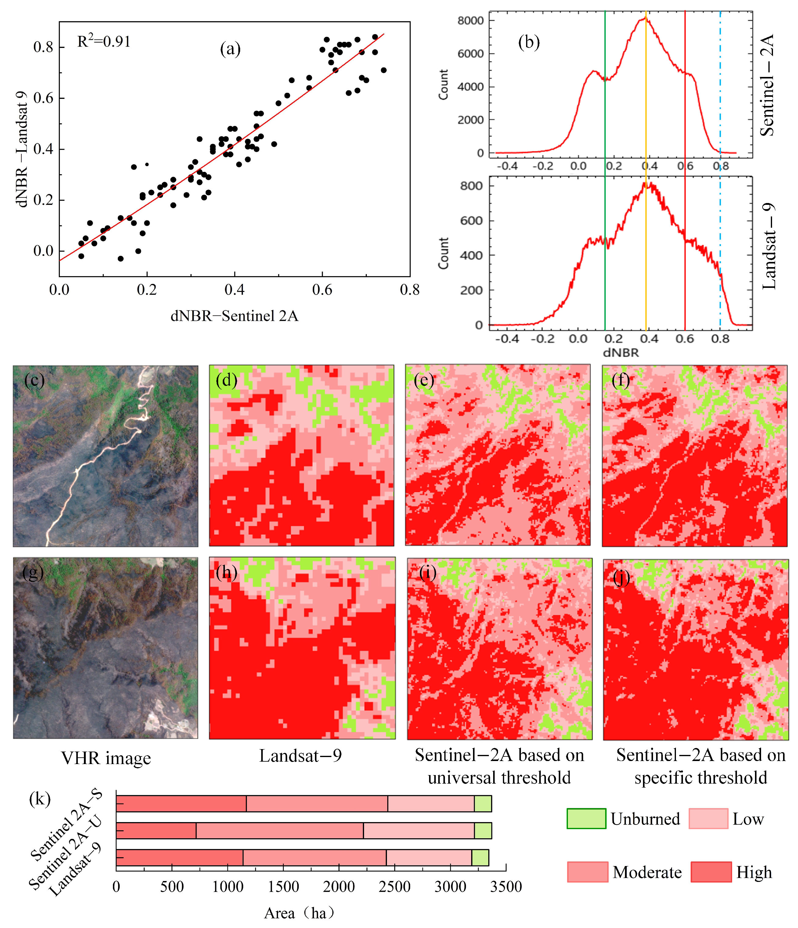- Han, L.; Dai, B.; Wang, Q.; Gao, Z. Influence of image selection and threshold on dnbr extraction of burned area. Remote Sens. Inf. 2023, 38, 47–55. [Google Scholar] [CrossRef]