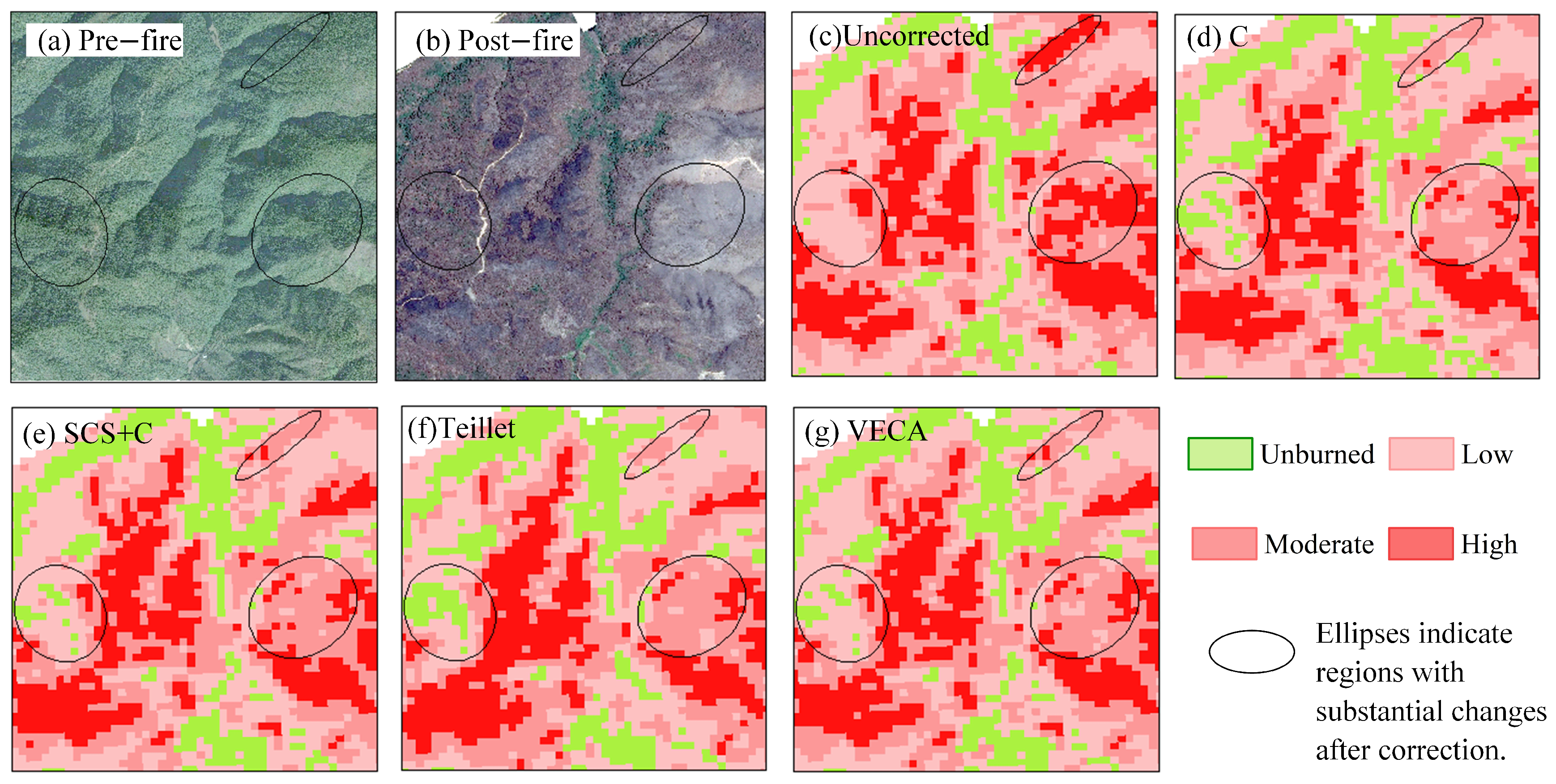 | Fire ID | Severity | Uncorrected | VECA | Teillet | SCS+C | C |