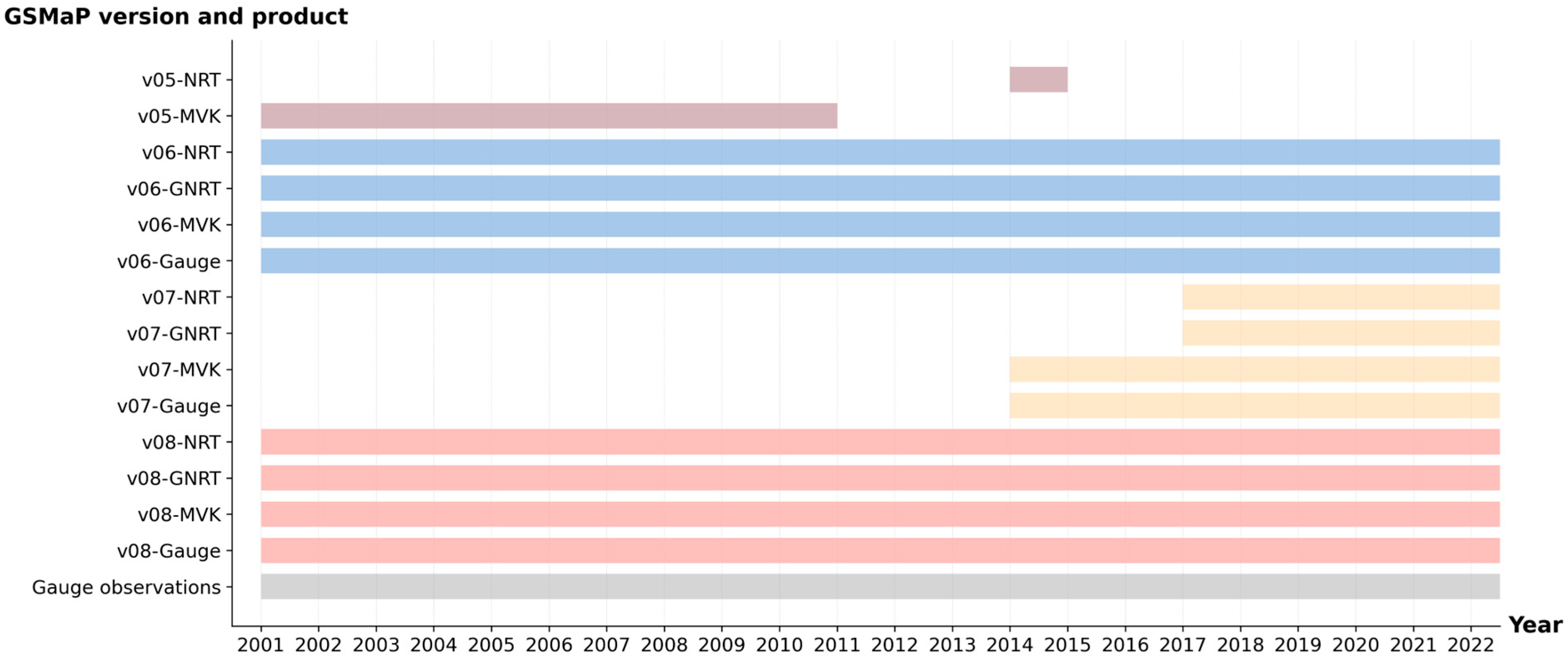 13]. GSMaP integrates observations from multiple passive microwave and infrared sensors and applies time-based propagation and smoothing techniques to generate continuous precipitation fields. It has been released in several versions (v05–v08) and includes multiple product types, such as GSMaP Near-Real-Time (NRT), GSMaP Moving Vector with Kalman filter (MVK), GSMaP gauge-adjusted Near-Real-Time (GNRT) and GSMaP gauge-adjusted product (Gauge), for real-time monitoring, climate analysis and hydrological applications [